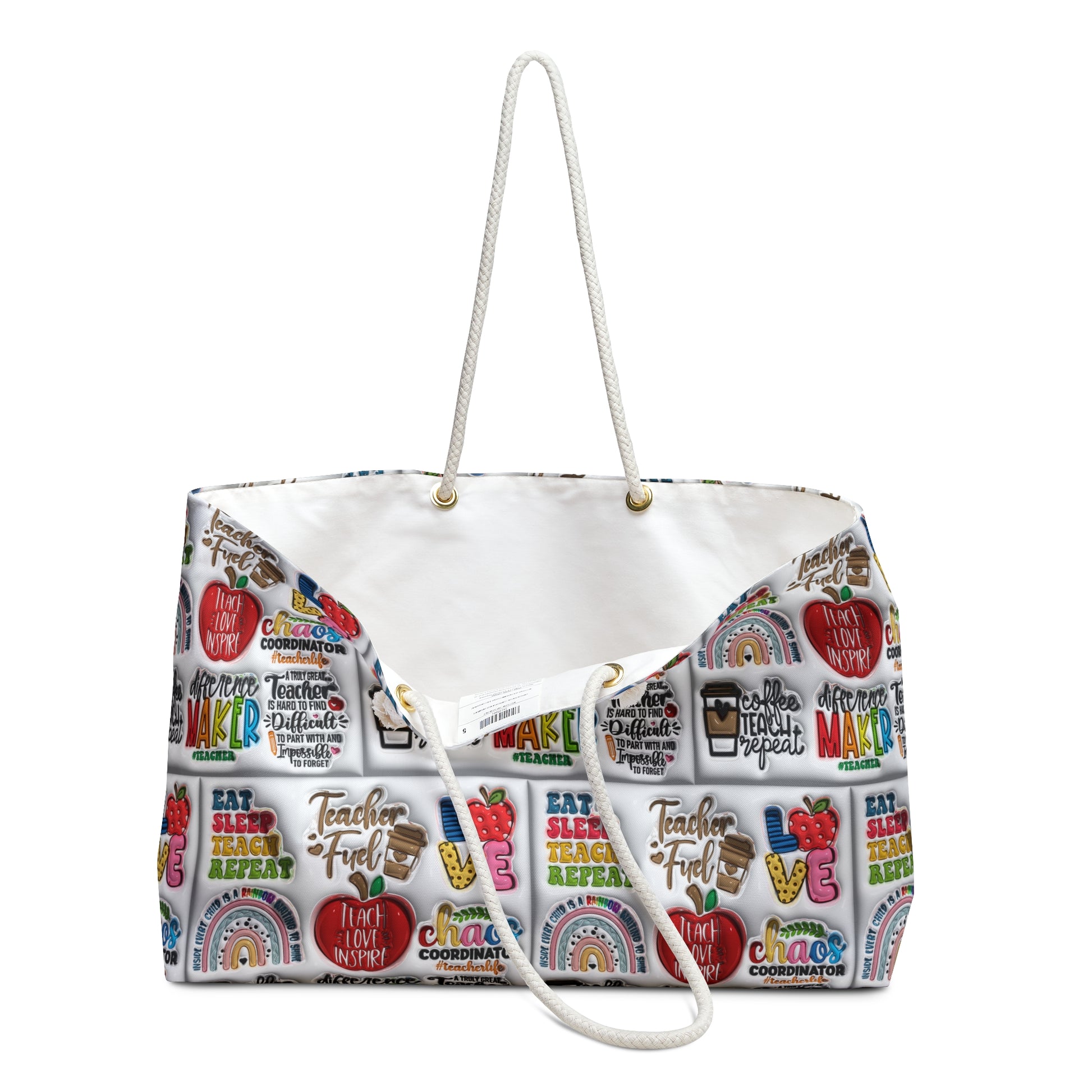 Teacher Bags! Teacher Gifts! Teacher Inspirational Quotes! Teacher Luggage! Our oversized Weekender Tote is perfect for your weekend at the beach or in town. The wide-mouthed, durable bag holds a generous amount of personal items and is easily held by its thick rope handles.
