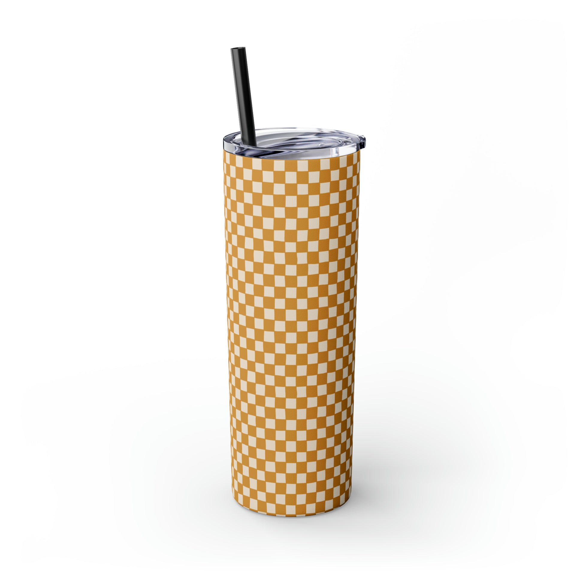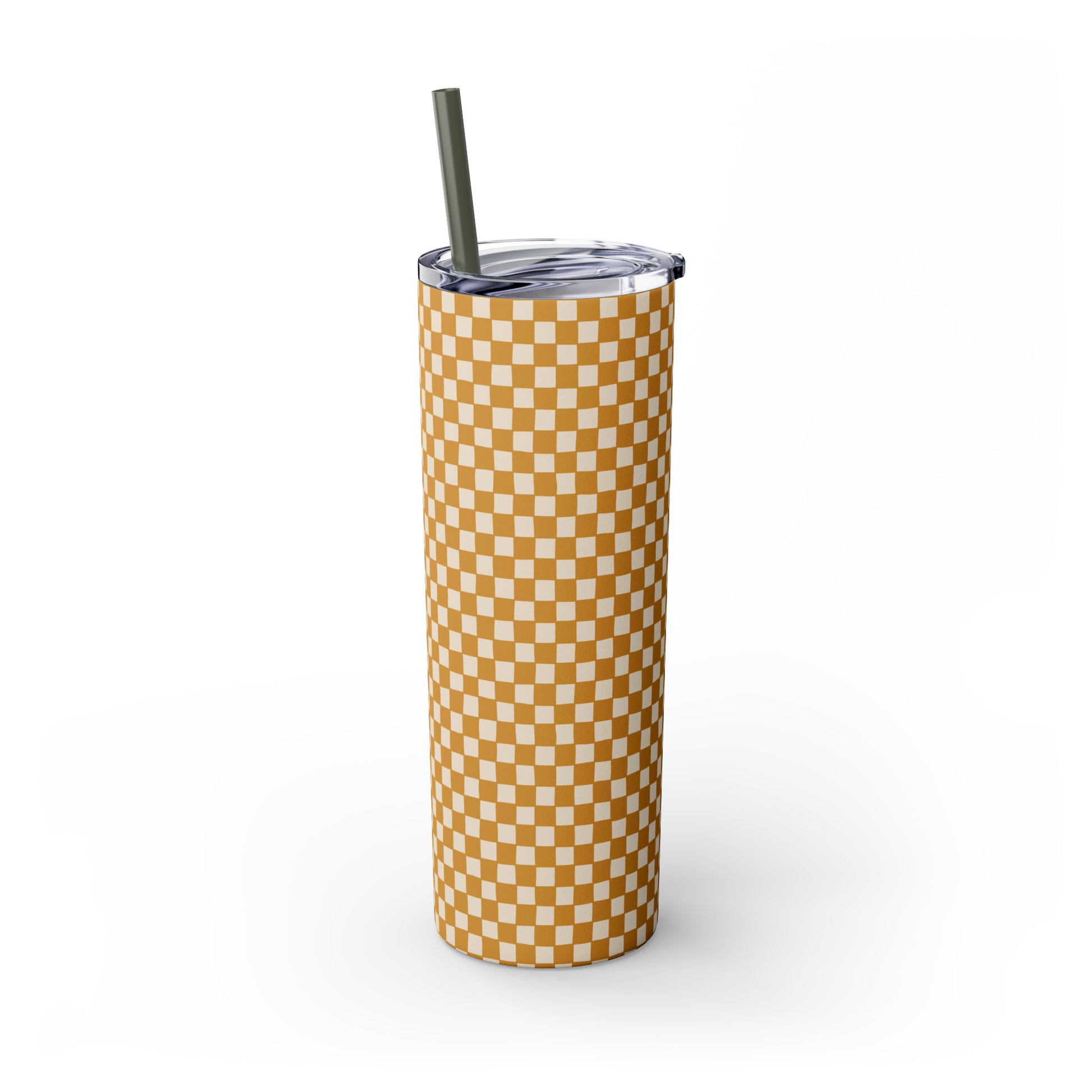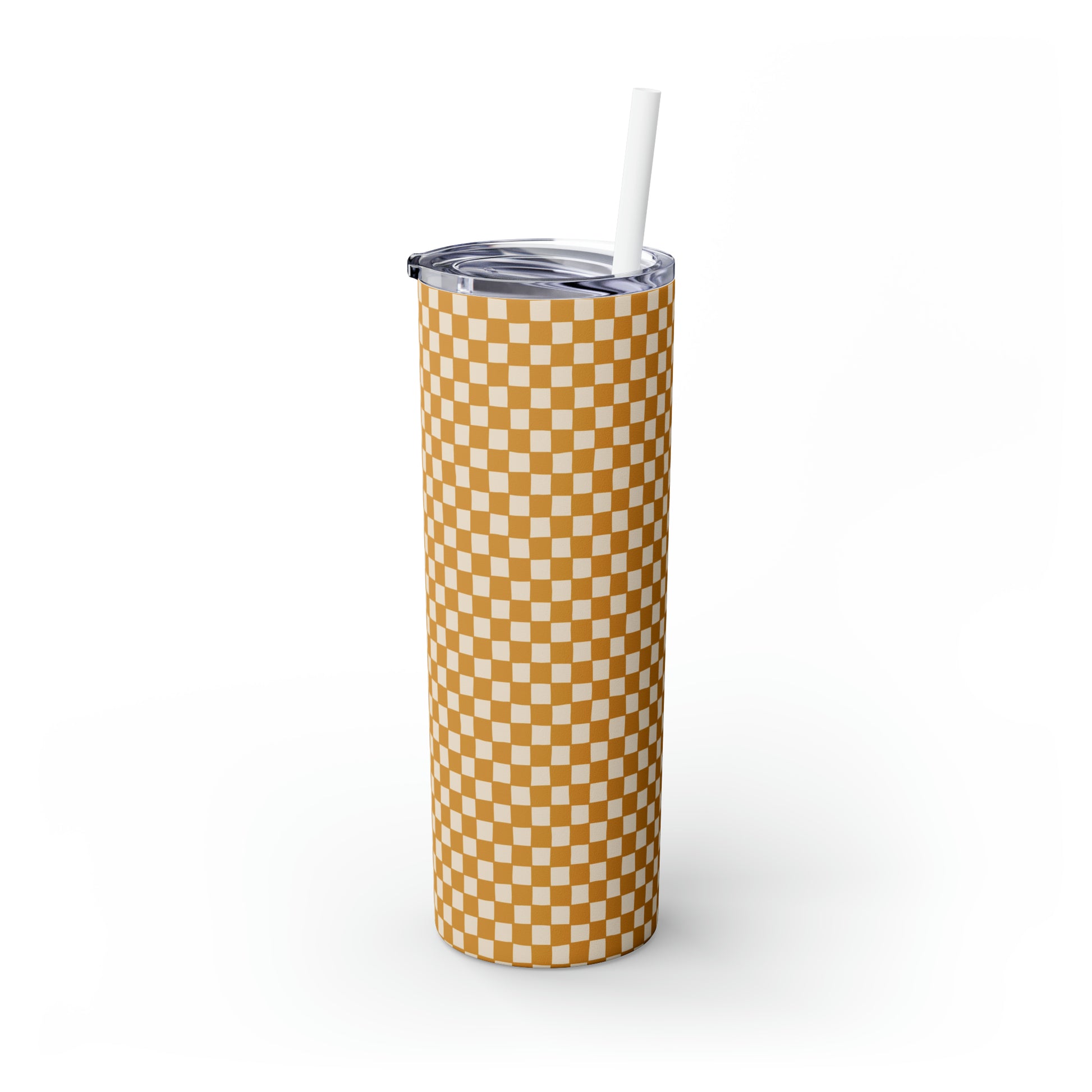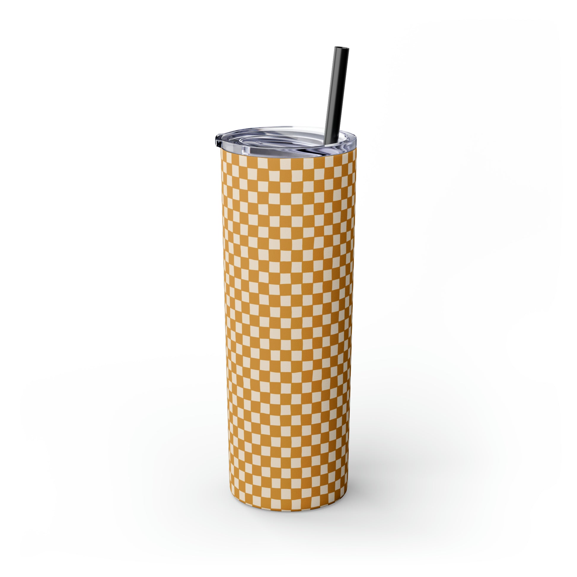 Boho Golden Checkerboard Print Skinny Tumbler with Straw, 20oz
