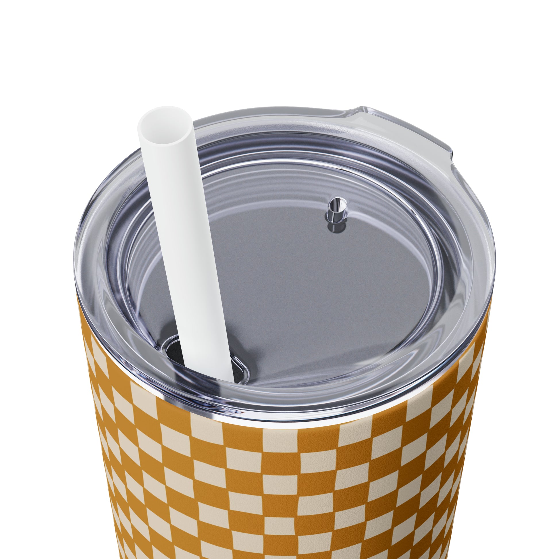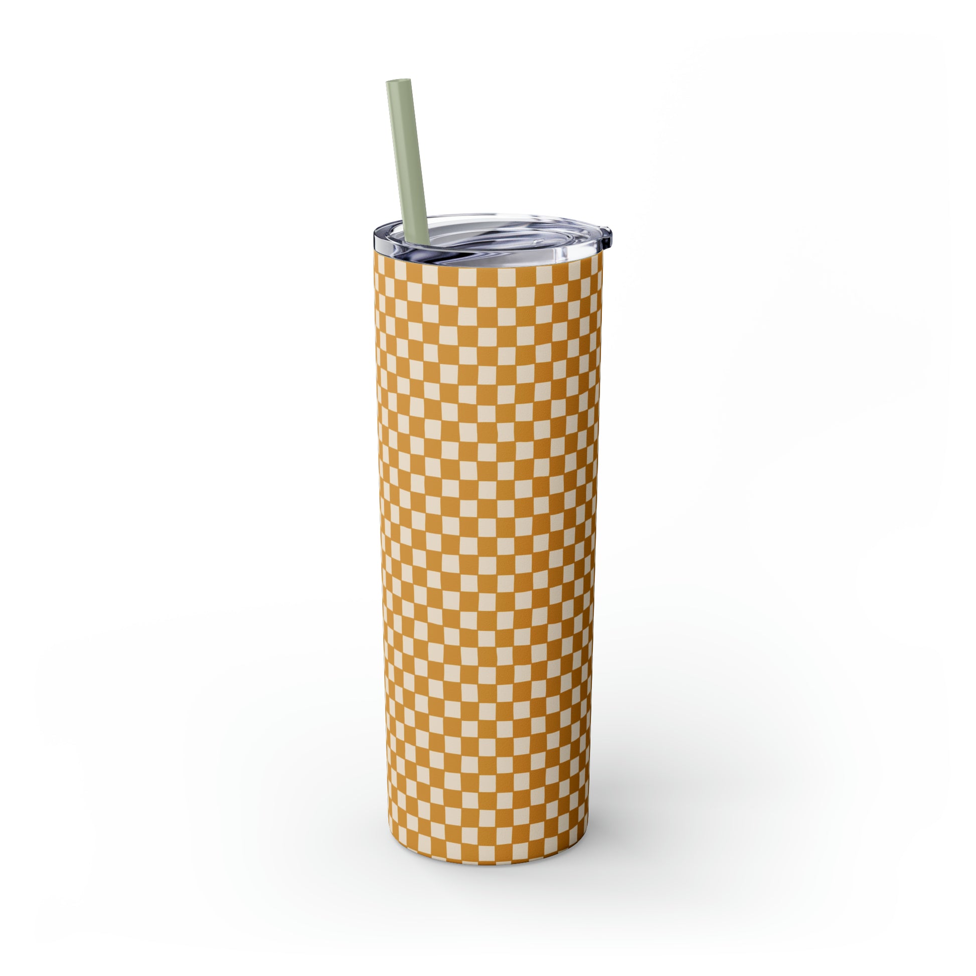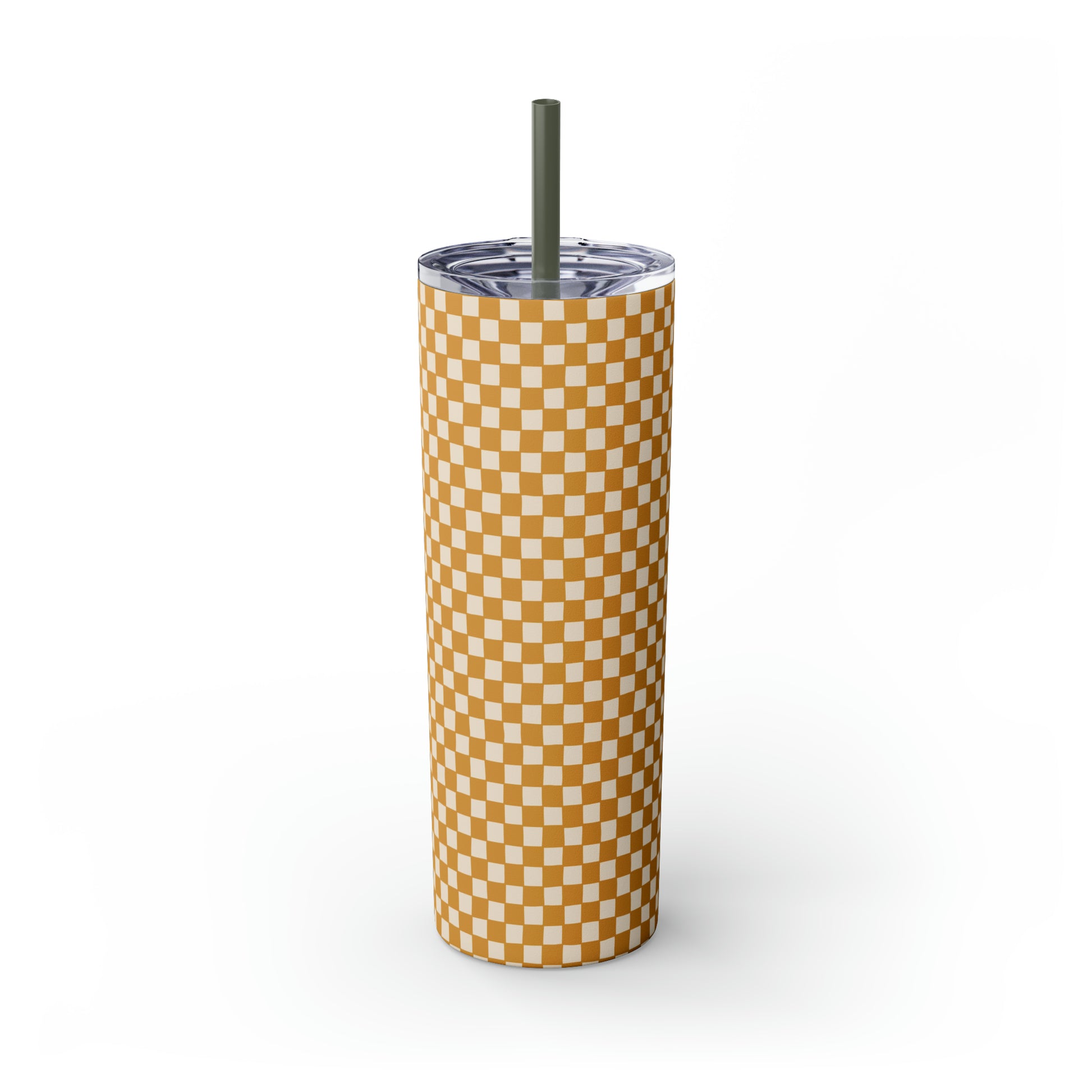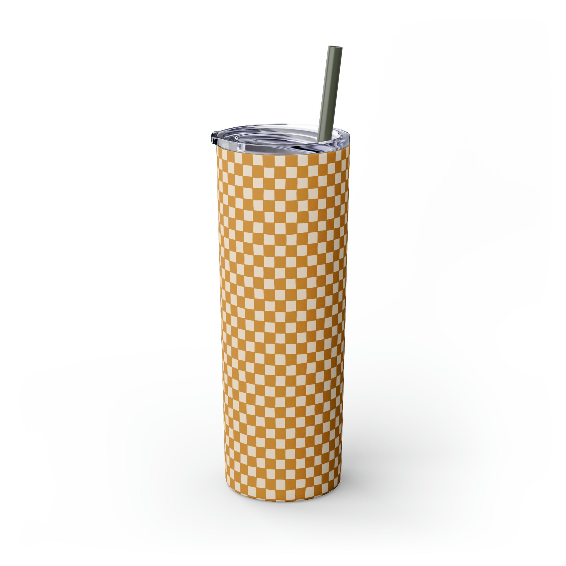 Boho Golden Checkerboard Print Skinny Tumbler with Straw, 20oz
