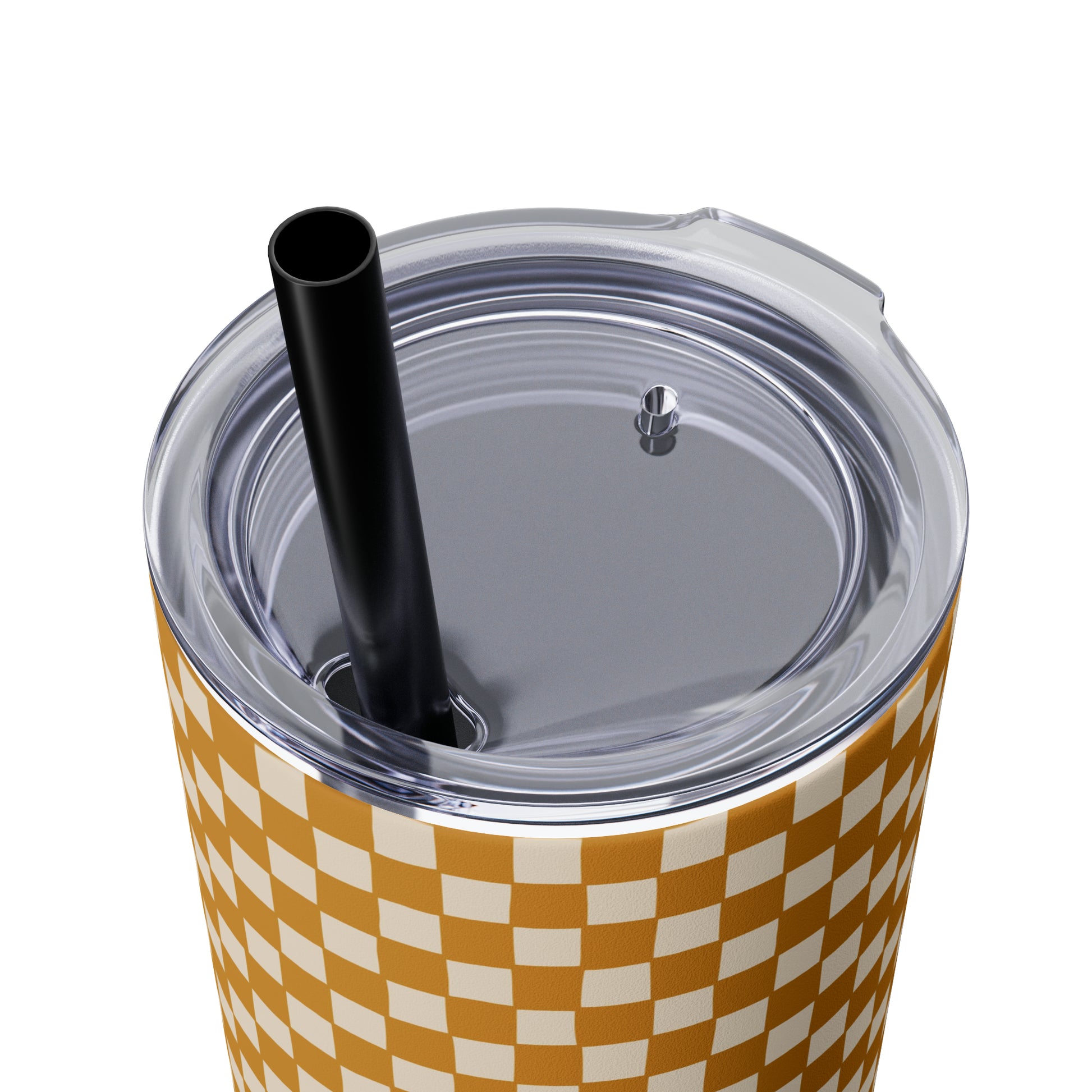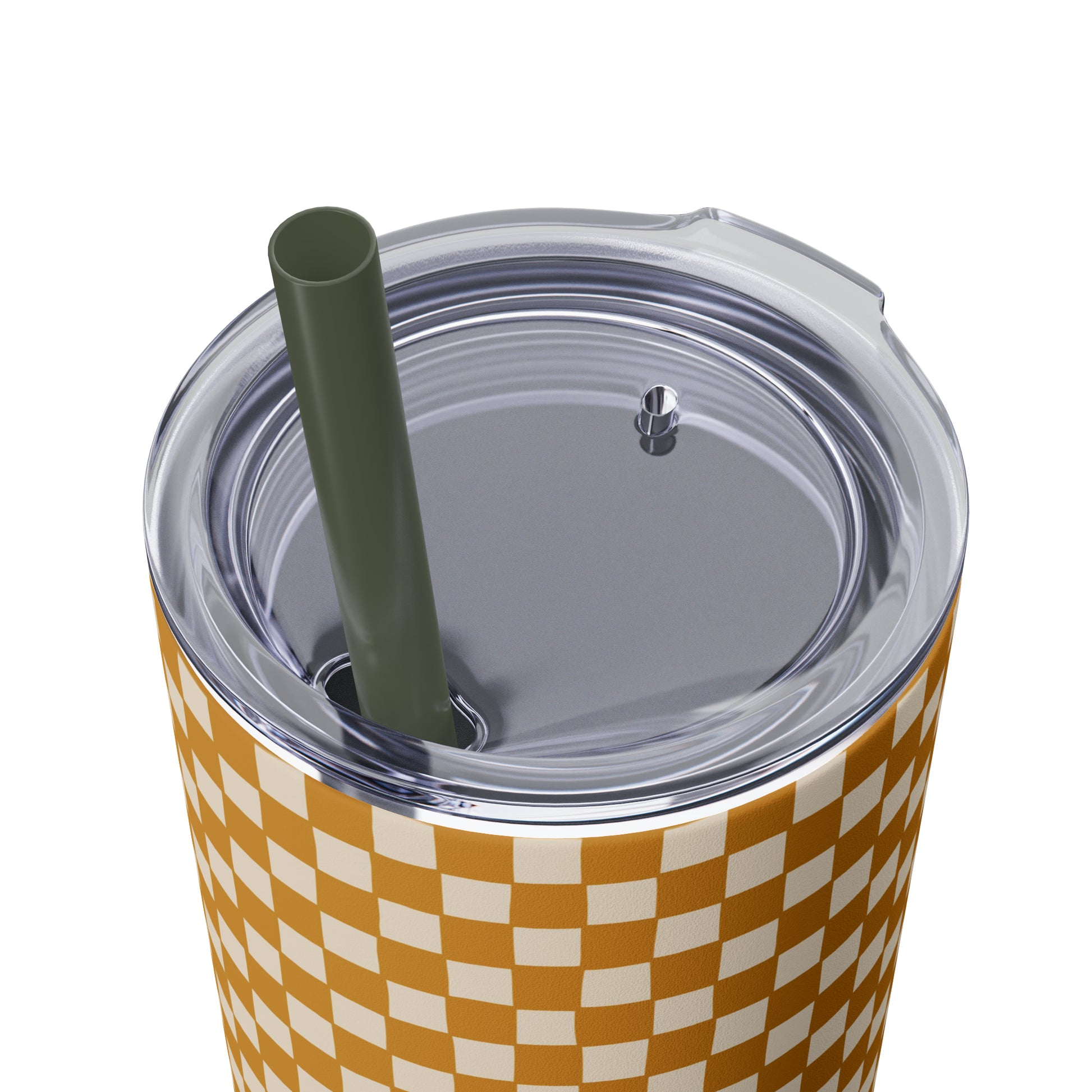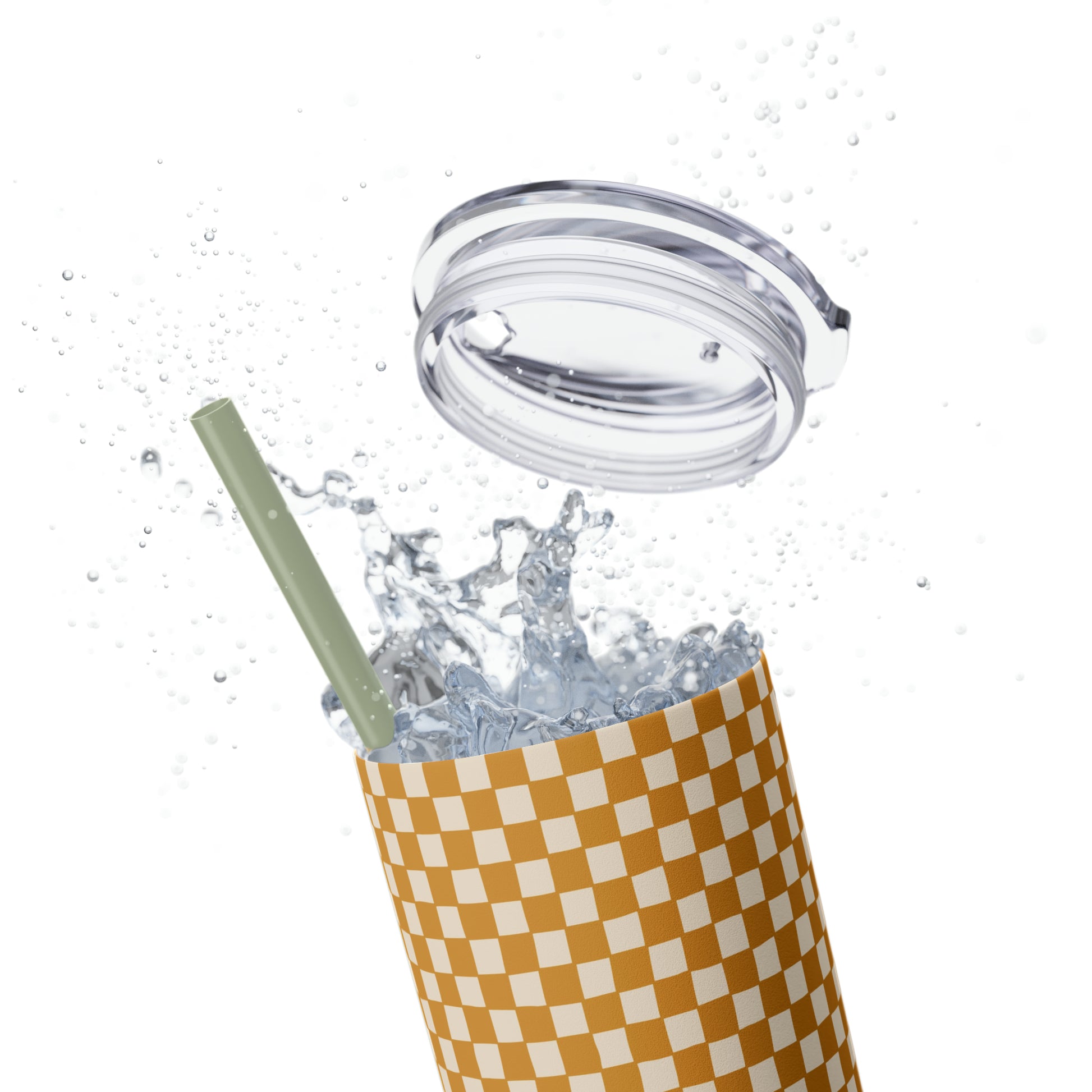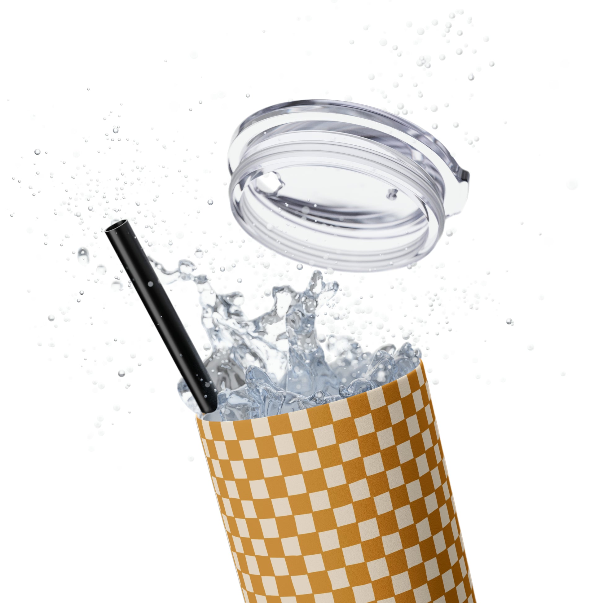 Boho Golden Checkerboard Print Skinny Tumbler with Straw, 20oz