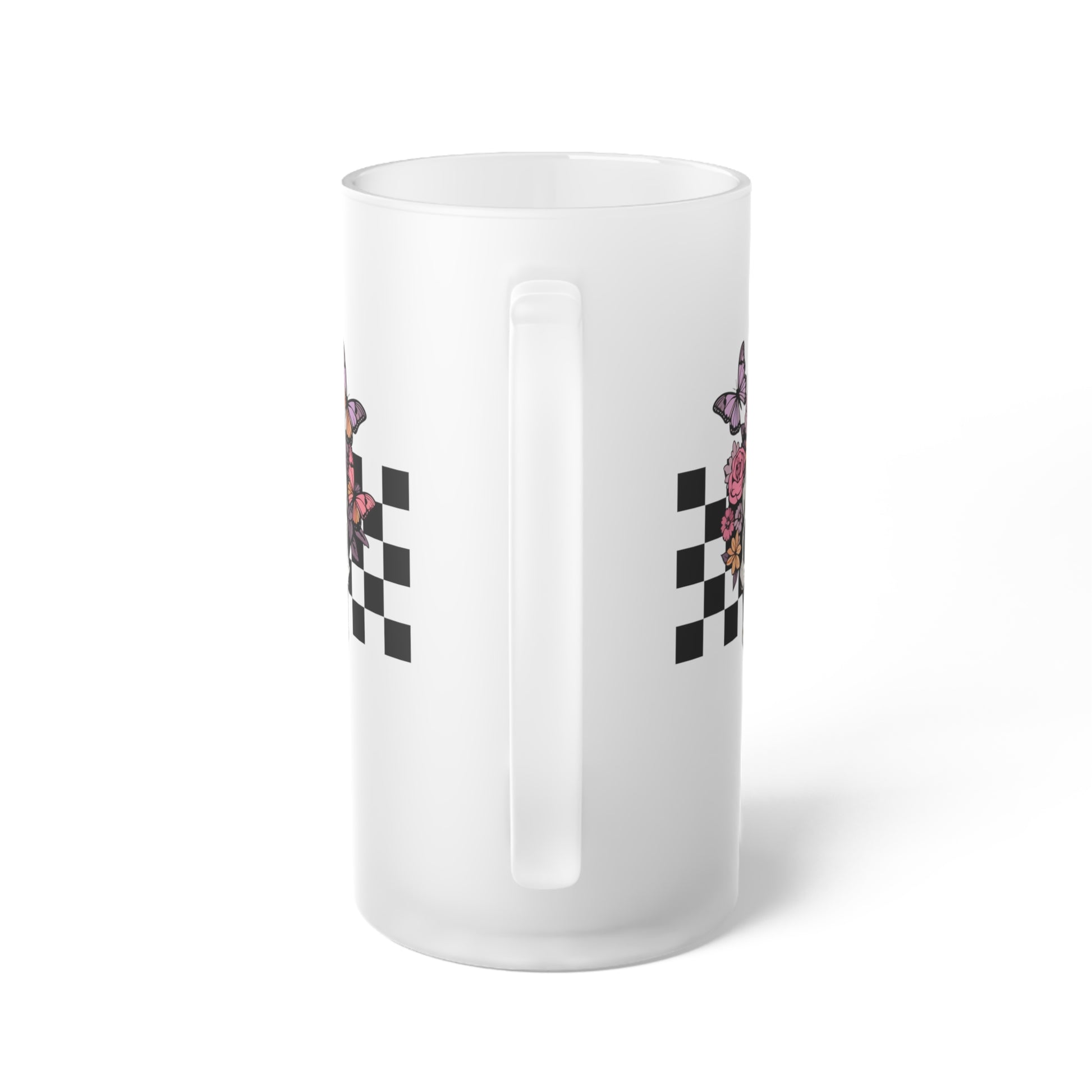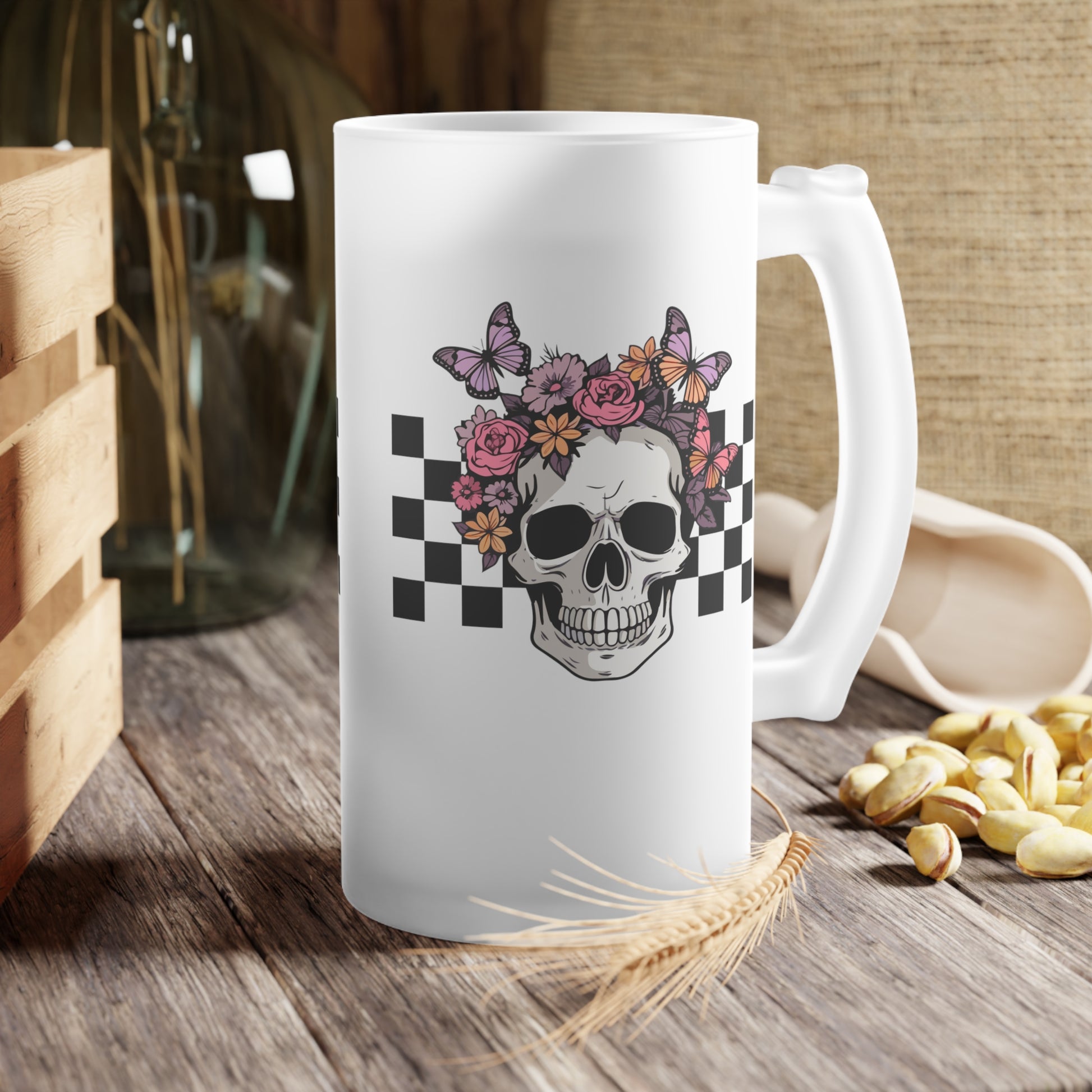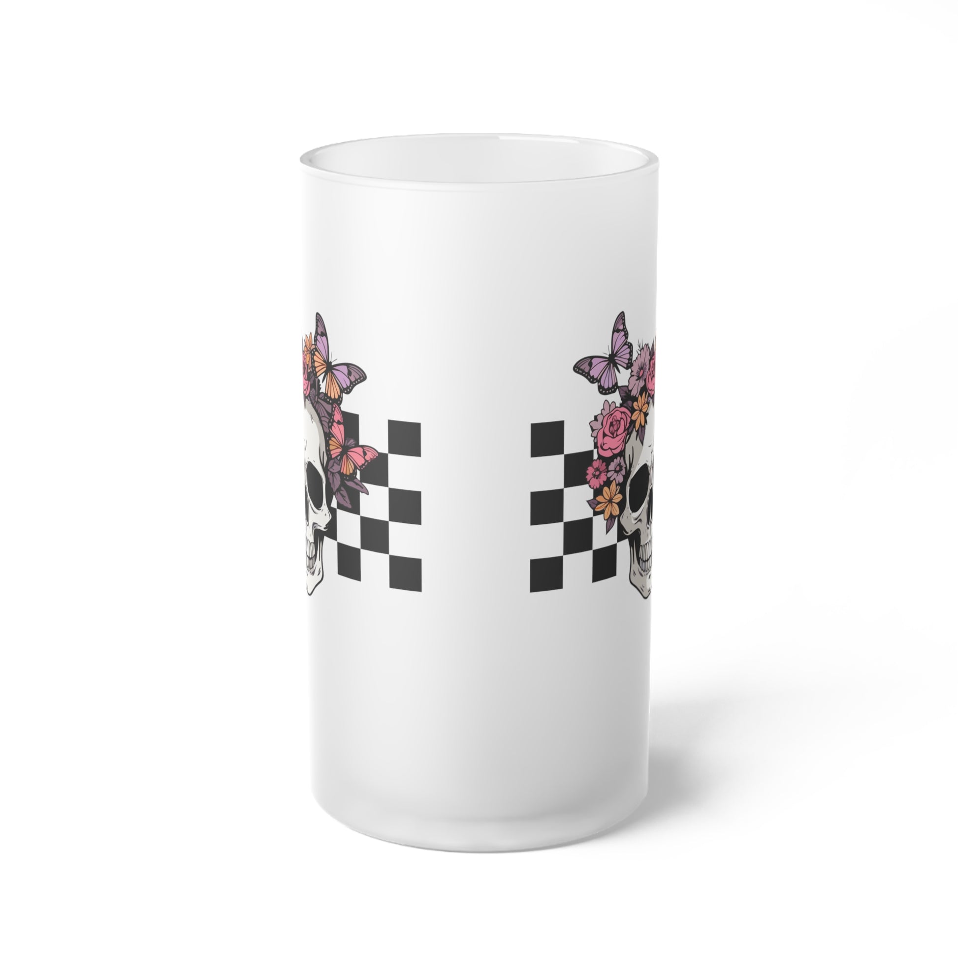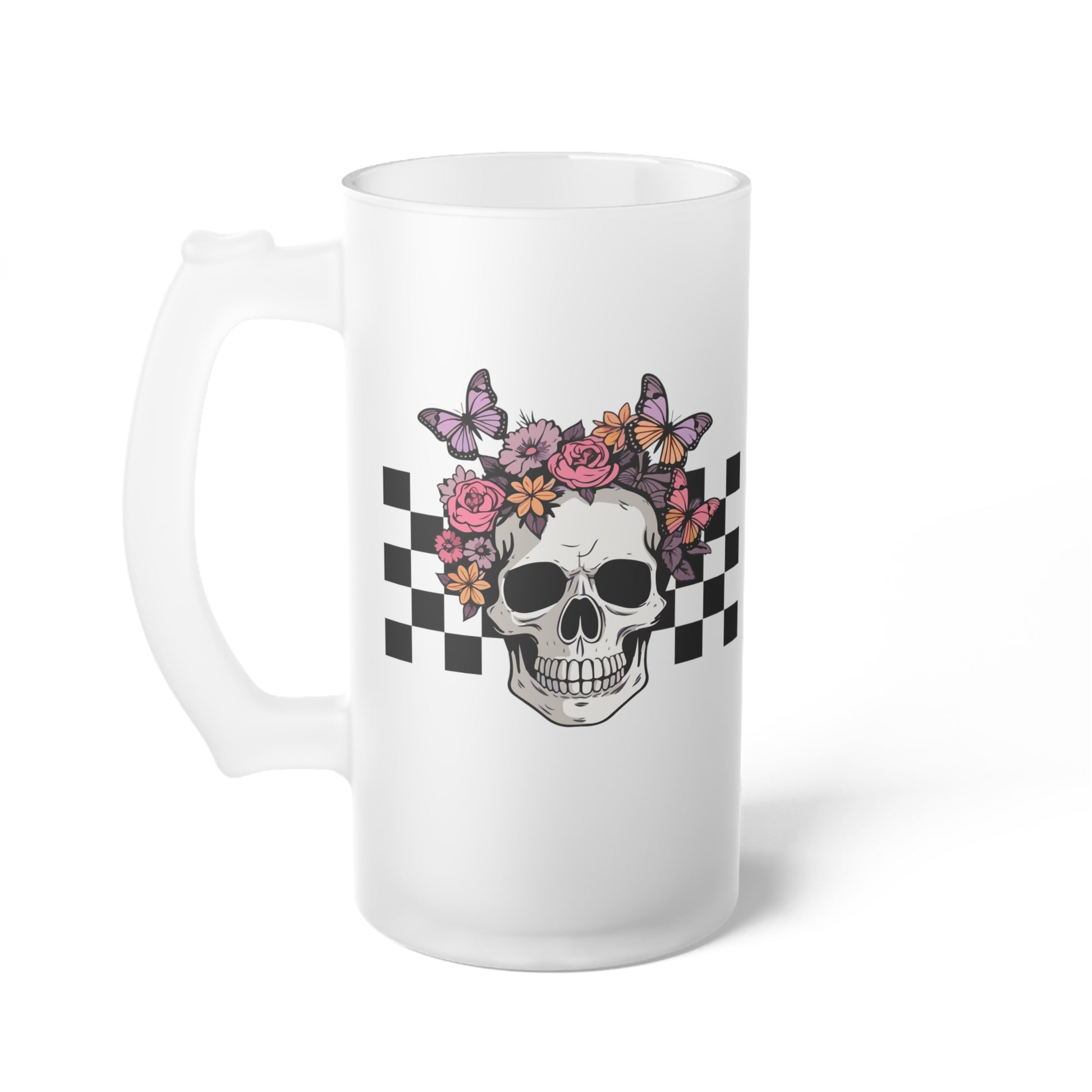 Floral Skeleton Head Hallowen/ Fall Logo Frosted Glass Beer Mug