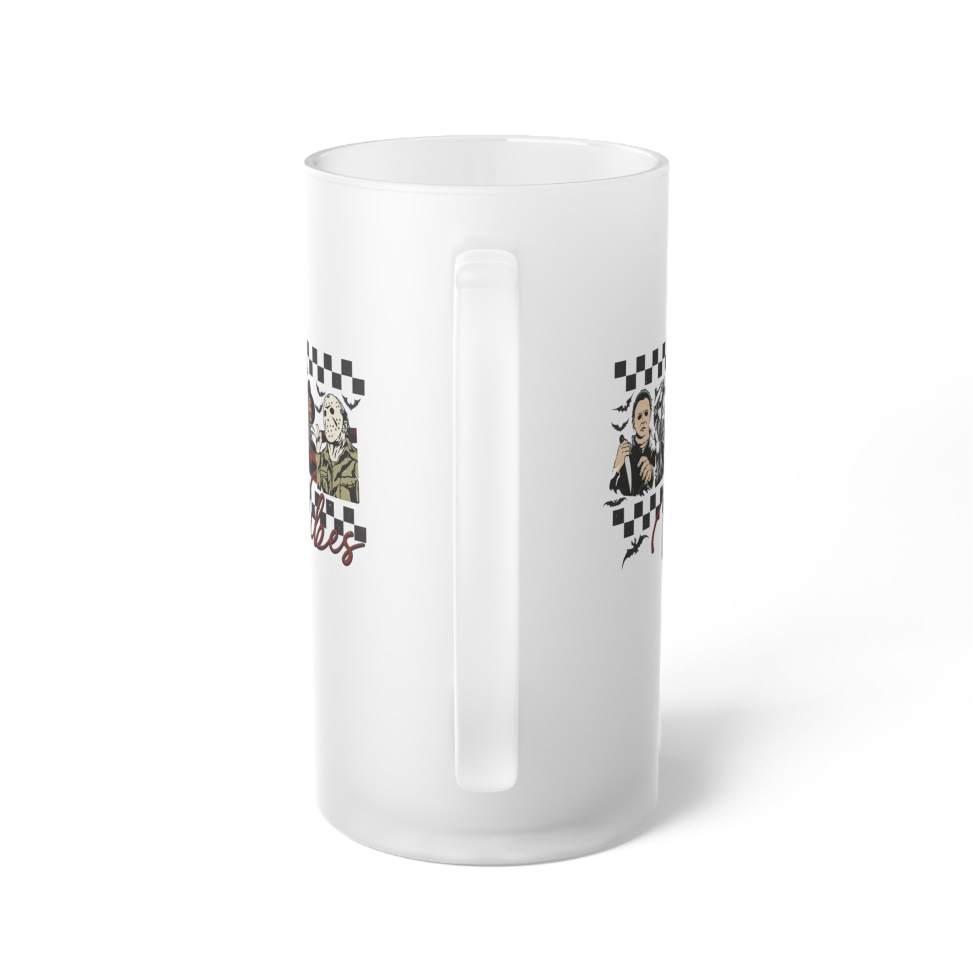 Horror Movie Gifts! Beer Mug! Drink up! The most aesthetically pleasing cup in anyone's kitchen, this frosted glass mug is perfect for sipping any drink in a stylish manner. It comes in one size: 16oz (0.473l) to keep you well-hydrated throughout the day. It's easy to clean – just pop it in the dishwasher for a quick rinse.