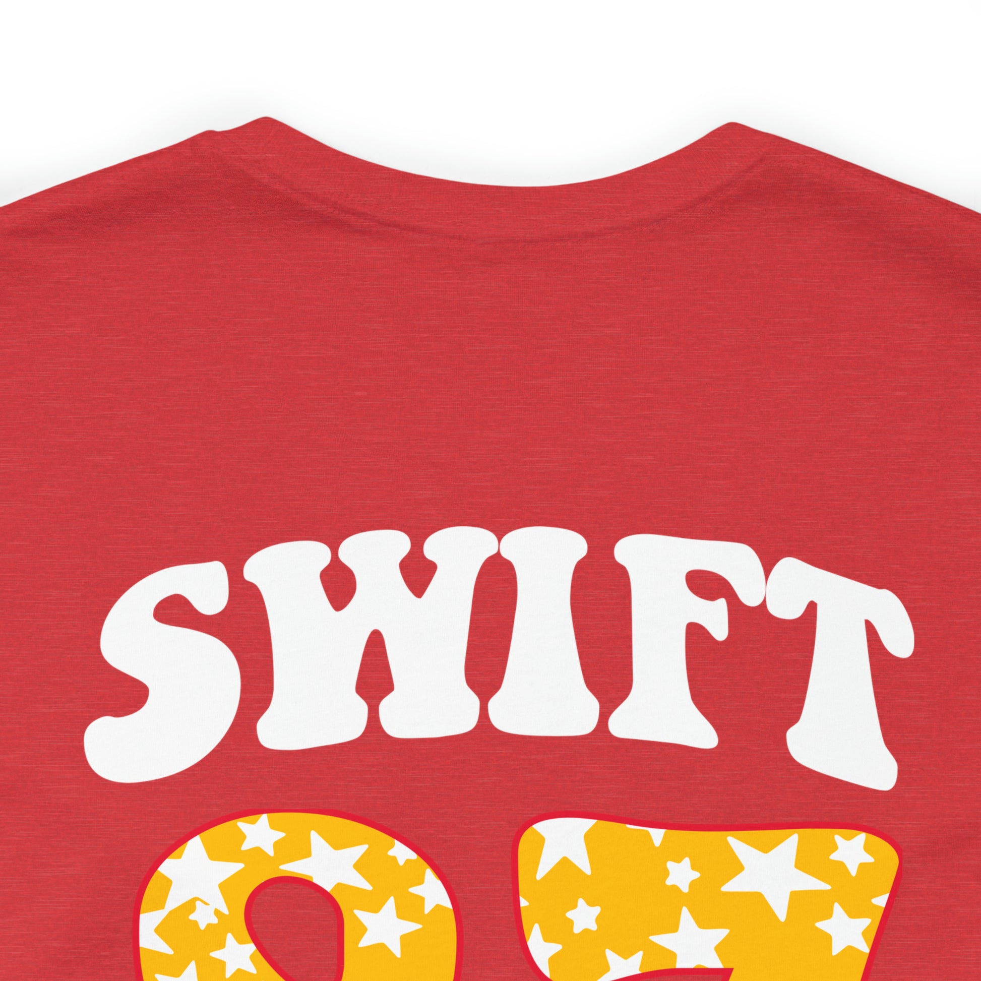 I love Kansas City! I love Football! KC Swift Shirts! Share your love of football, Kelce and Swift. 87 Football Shirt! Travis and Taylor Shirts! This classic unisex jersey short sleeve tee fits like a well-loved favorite. Soft cotton and quality print make users fall in love with it over and over again. These t-shirts have-ribbed knit collars to bolster shaping. The shoulders have taping for better fit over time. Dual side seams hold the garment's shape for longer.