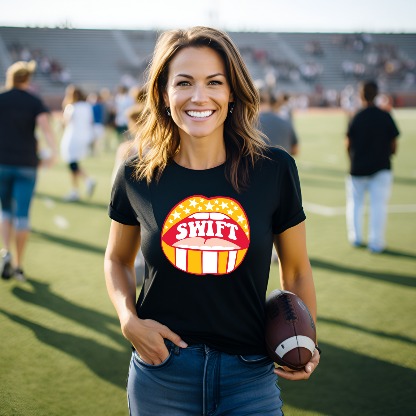I love Kansas City! I love Football! KC Swift Shirts! Share your love of football, Kelce and Swift. 87 Football Shirt! Travis and Taylor Shirts! This classic unisex jersey short sleeve tee fits like a well-loved favorite. Soft cotton and quality print make users fall in love with it over and over again. These t-shirts have-ribbed knit collars to bolster shaping. The shoulders have taping for better fit over time. Dual side seams hold the garment's shape for longer.