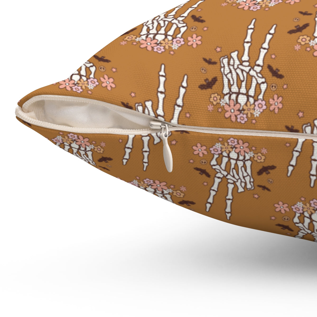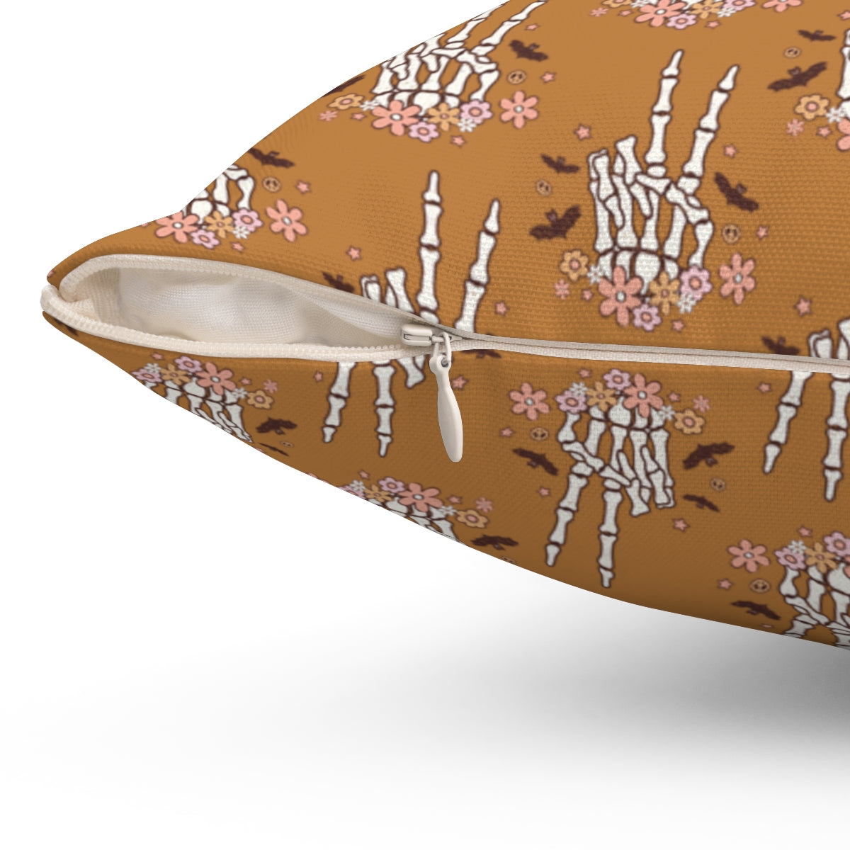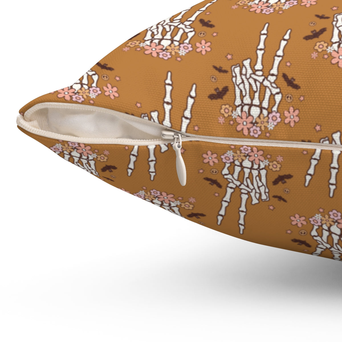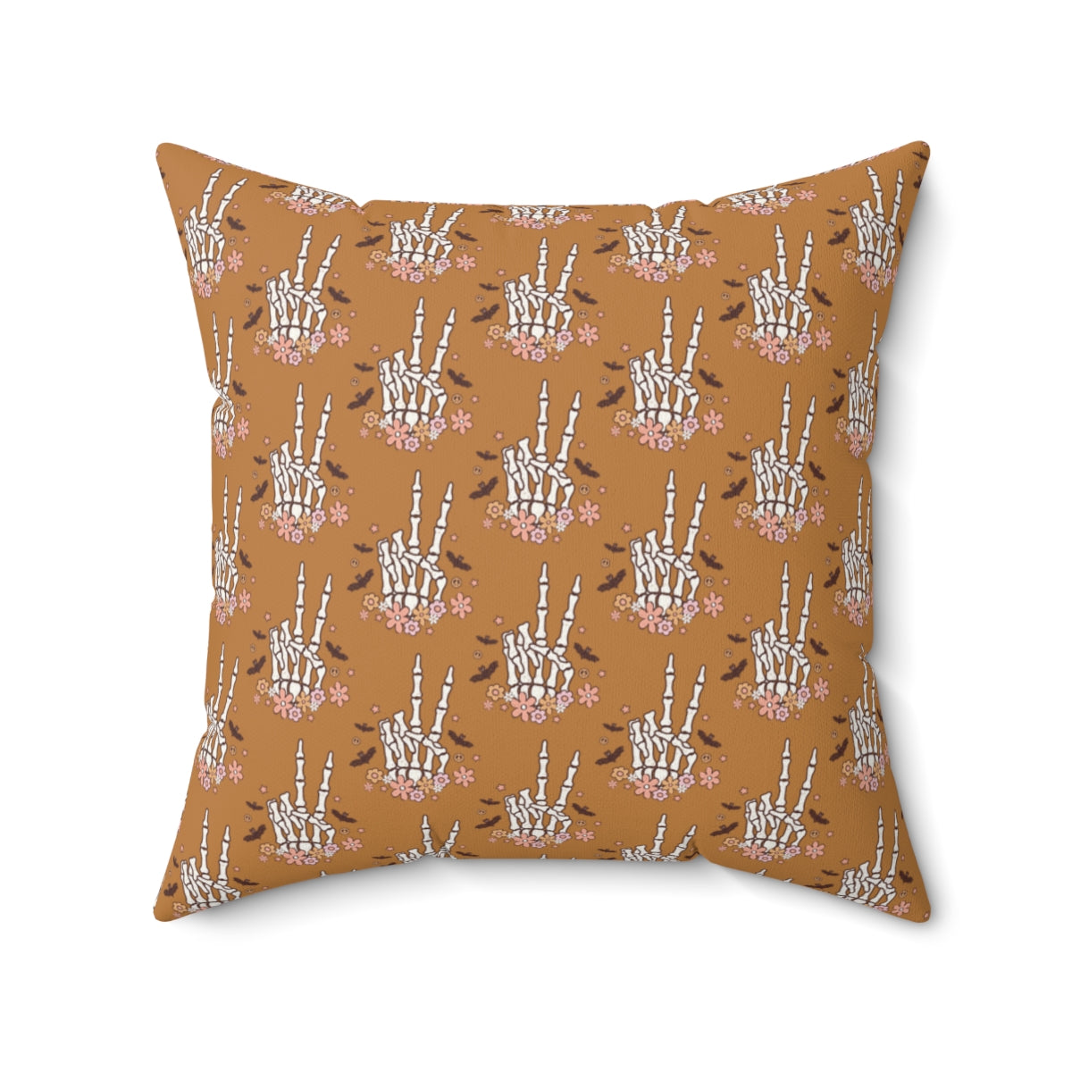 Light Brown Boho Skeleton Hand Peace Sign Pattern Fall Halloween Spun Polyester Square Pillow