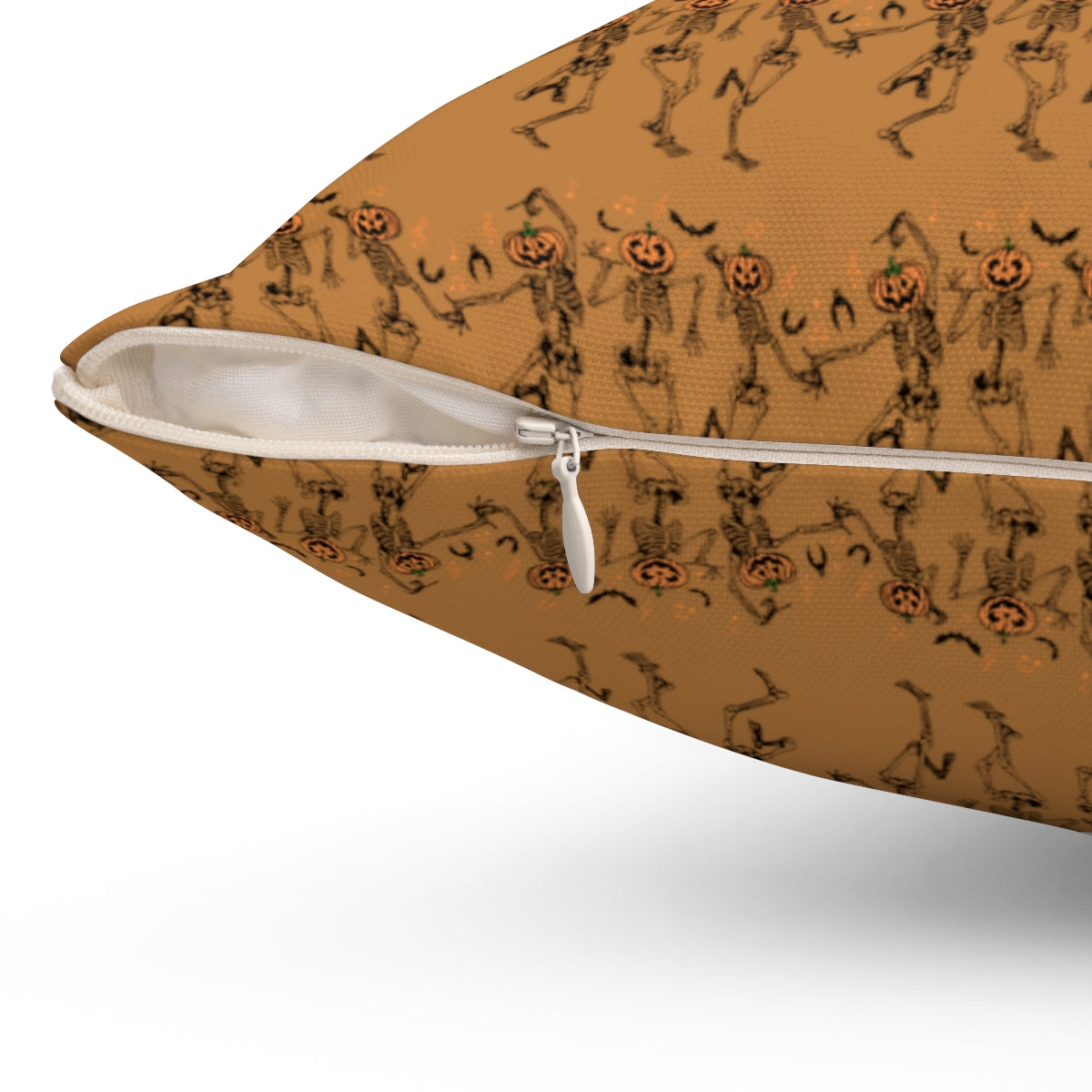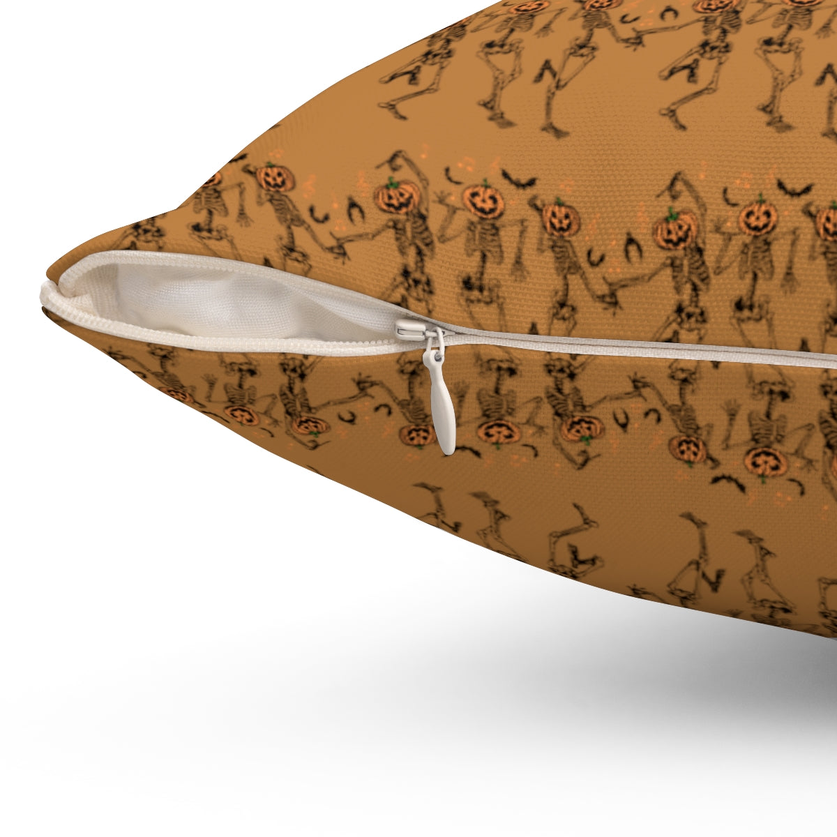 Light Brown Dancing Pumpkin Head Skeletons Pattern Fall Halloween Spun Polyester Square Pillow