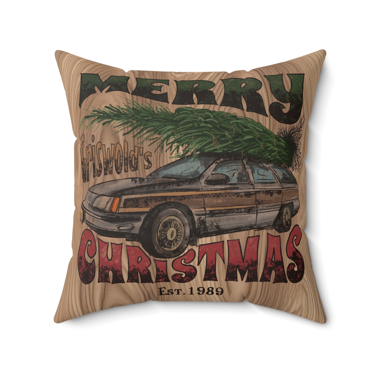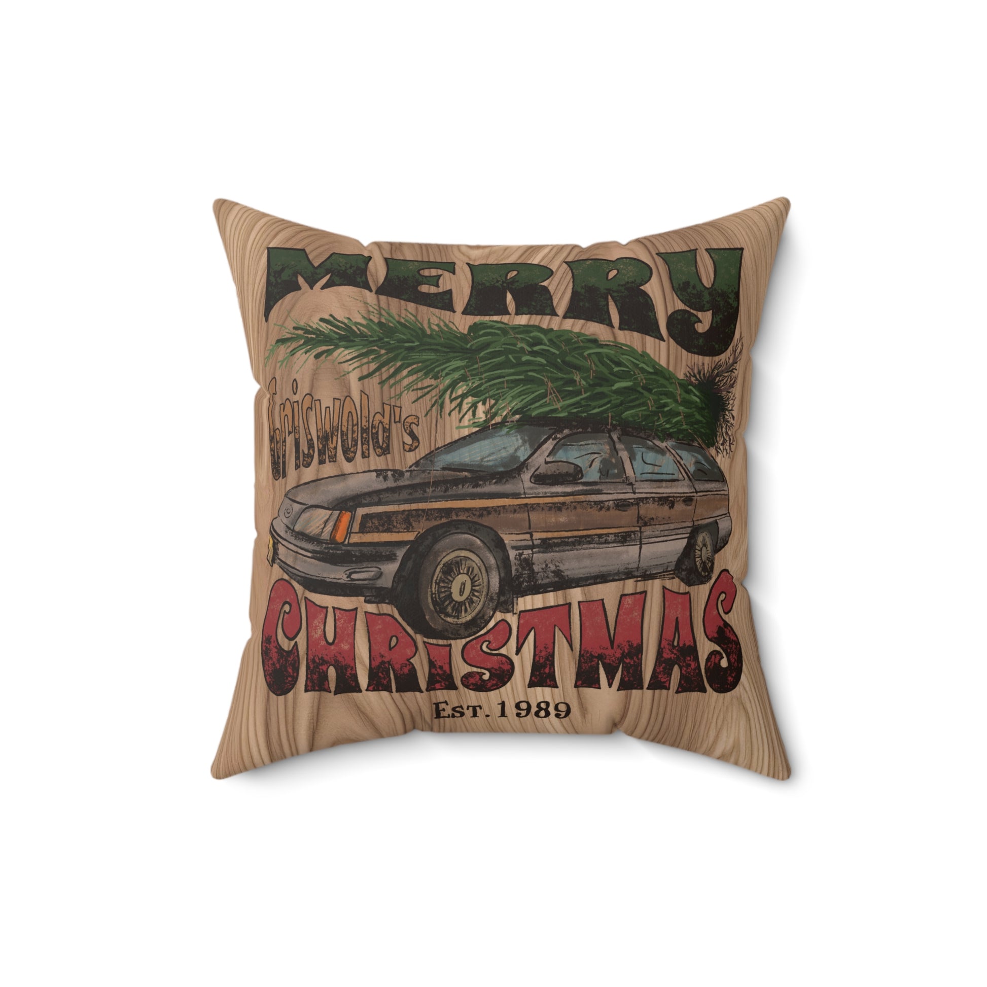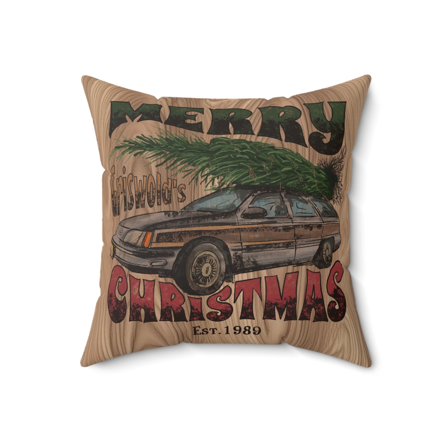 Distressed Merry Griswold's Christmas Tree Station Wagon Holiday Polyester Square Pillow