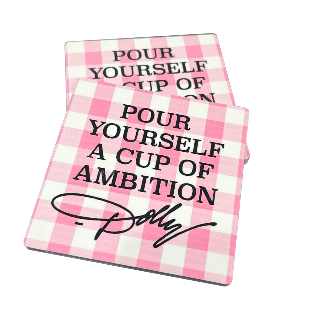 Pour Yourself a Cup of Ambition Coasters - pink plaid with this wonderful saying. Sandstone coasters printed - one per order