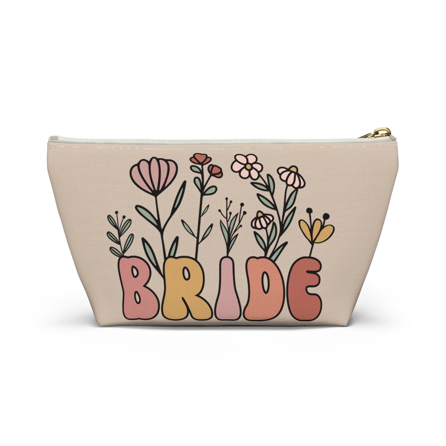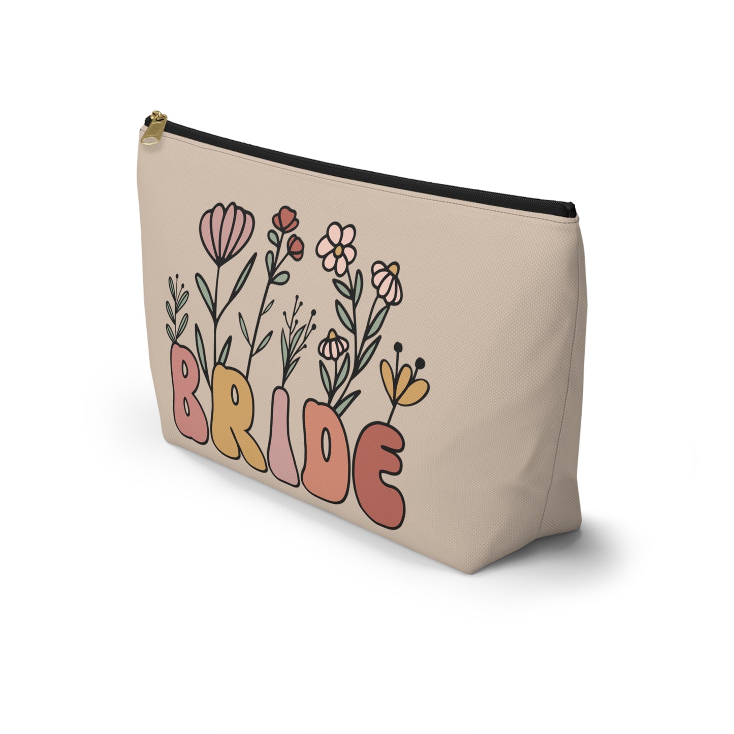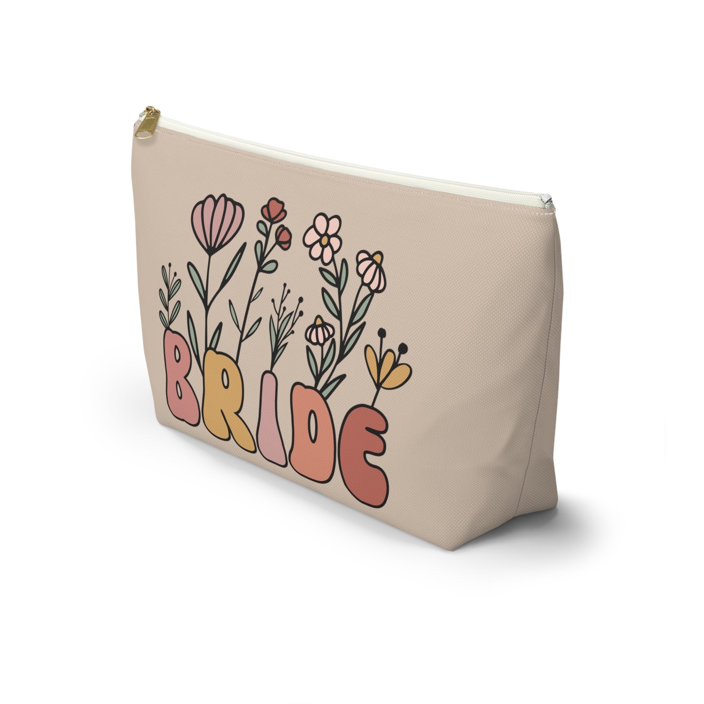 This Retro Boho Bride Floral Print Design pouch is great for to carry around or use for a first aid kit, make-up, medicine bag, pencil pouch, etc.... Our t-bottom pouches vary from small to large and can be used for pretty much anything. They make excellent pencil cases and cosmetic travel bags. They are constructed from a durable material with a zipper closure. Bride Gift!