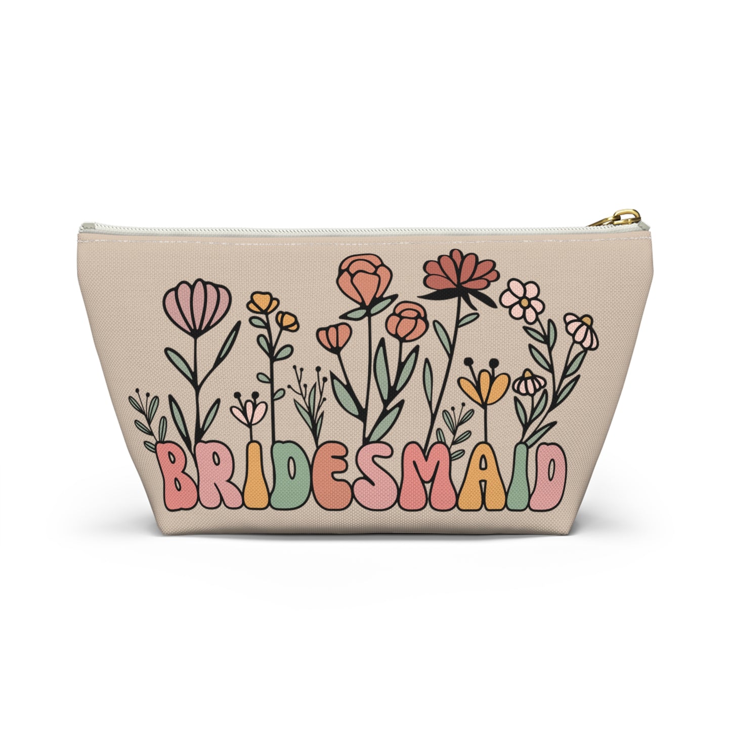 This Retro Boho Bridesmaid Floral Print Design pouch is great for to carry around or use for a first aid kit, make-up, medicine bag, pencil pouch, etc.... Our t-bottom pouches vary from small to large and can be used for pretty much anything. They make excellent pencil cases and cosmetic travel bags. They are constructed from a durable material with a zipper closure. Bridesmaid Gift!