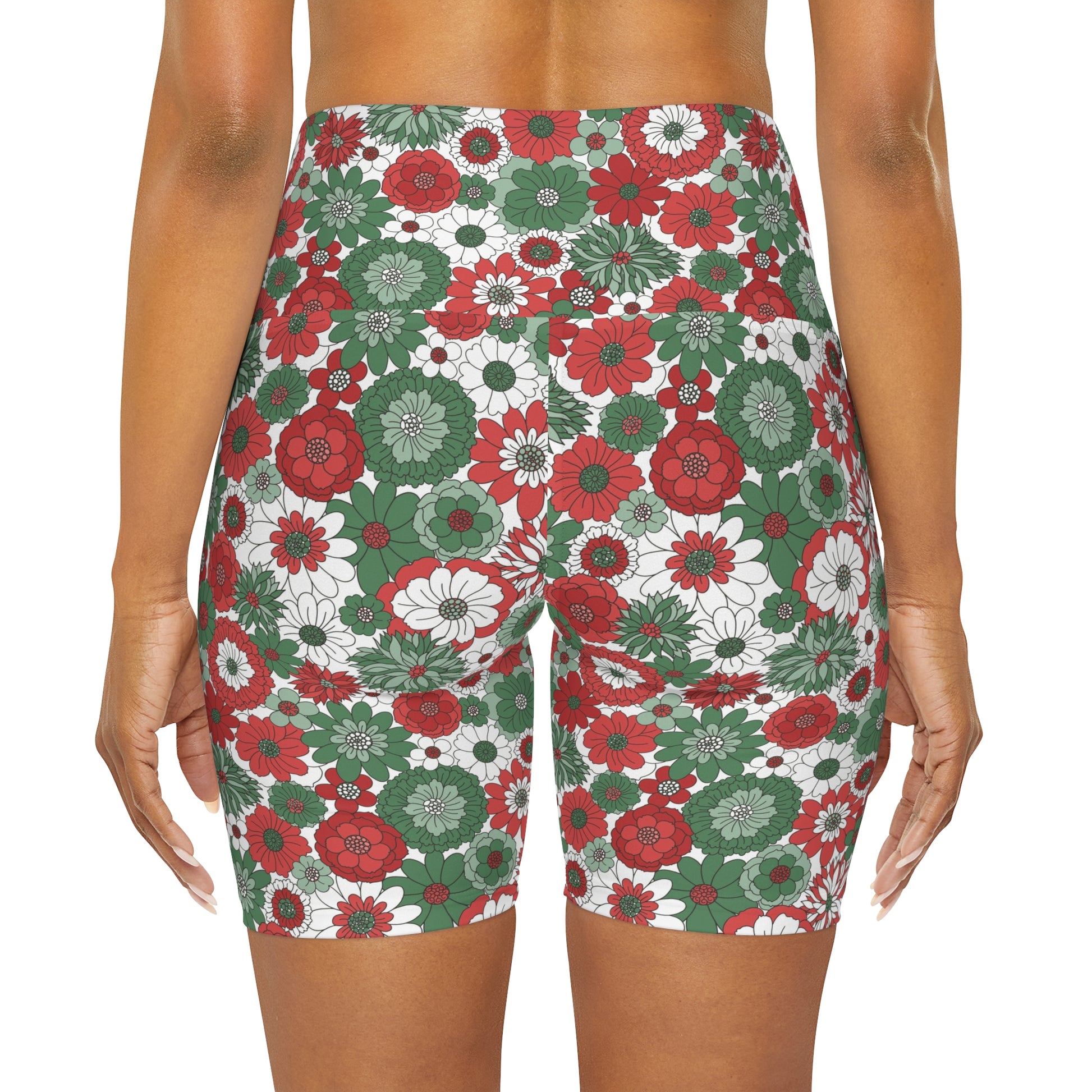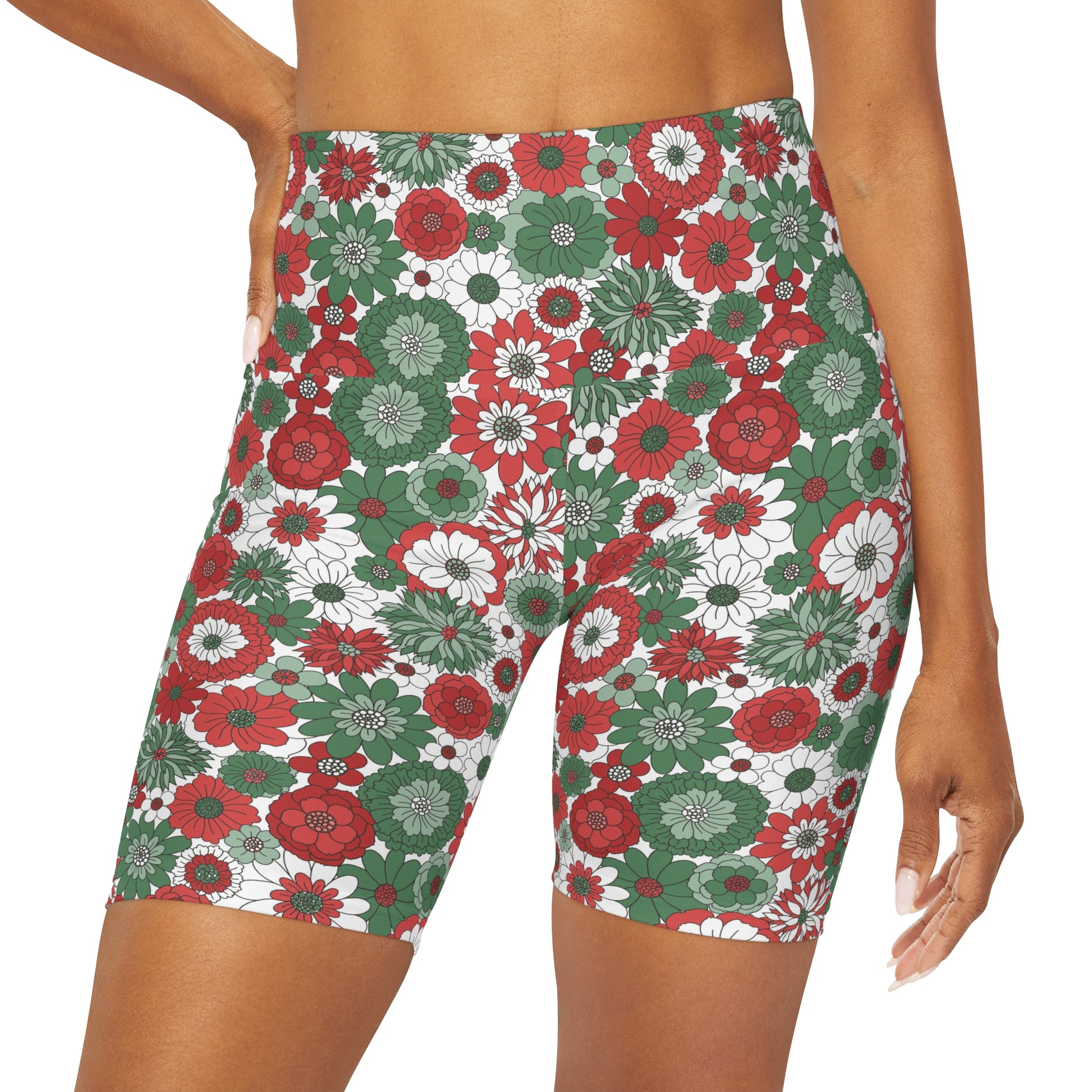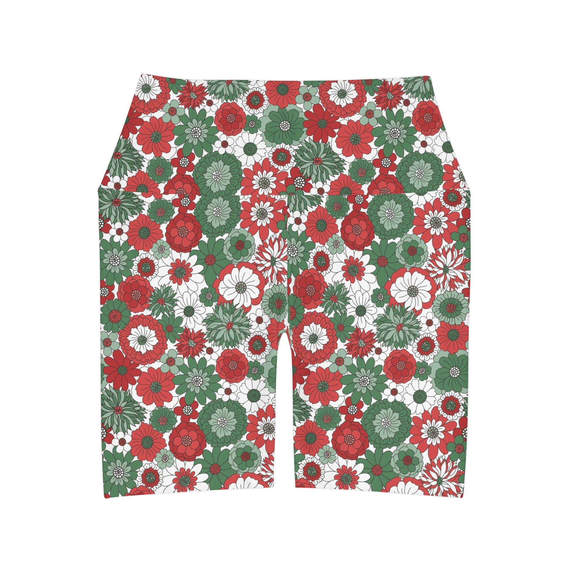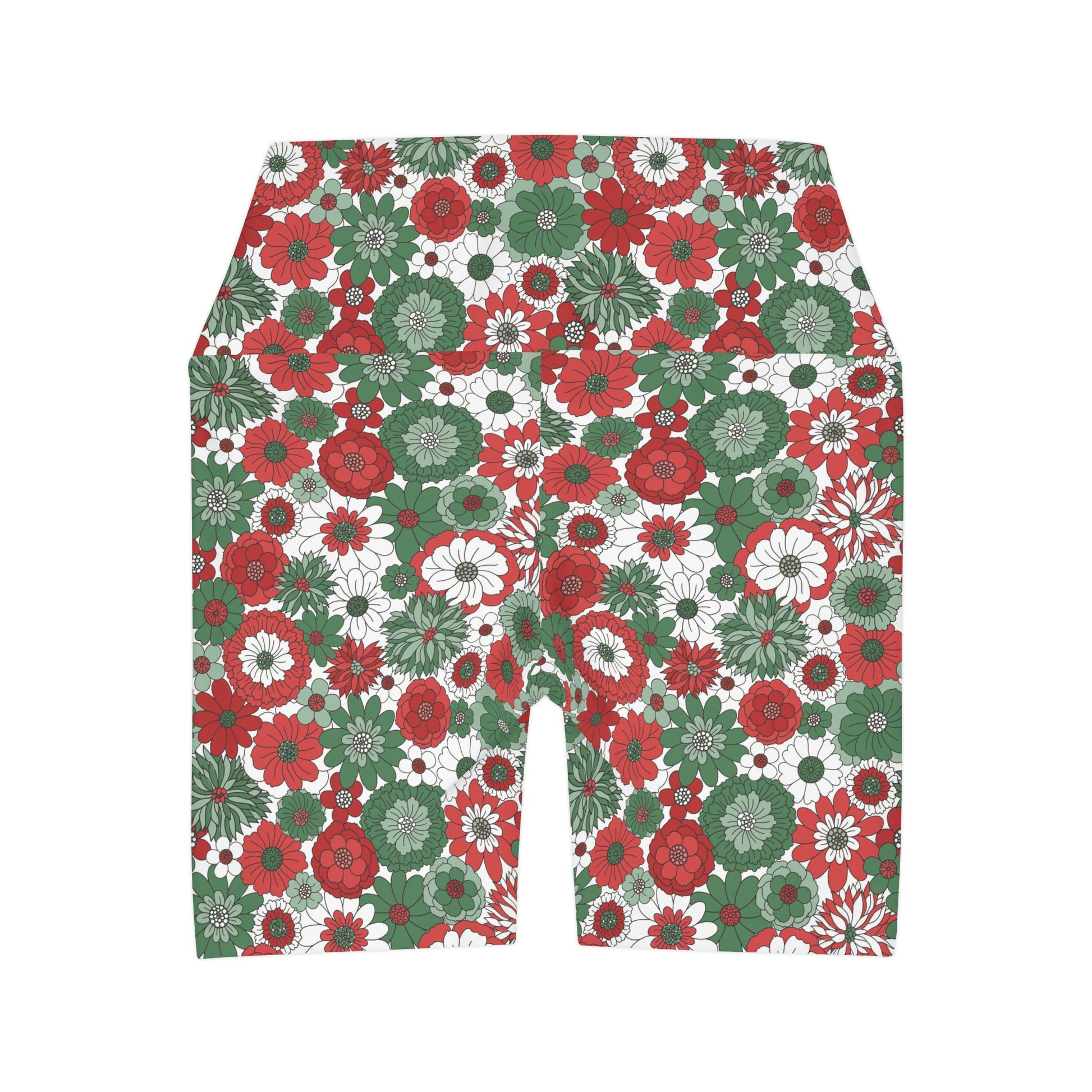 Retro Christmas Holiday Floral Red Green and White Yoga Shorts