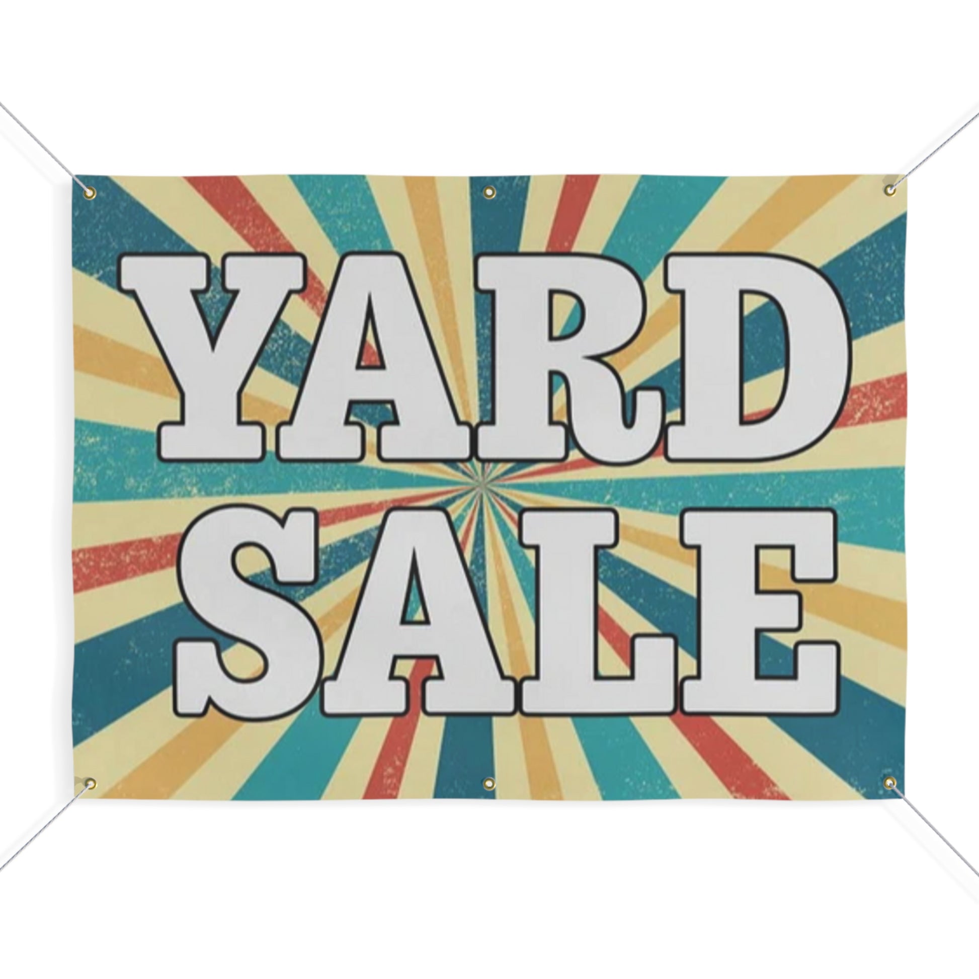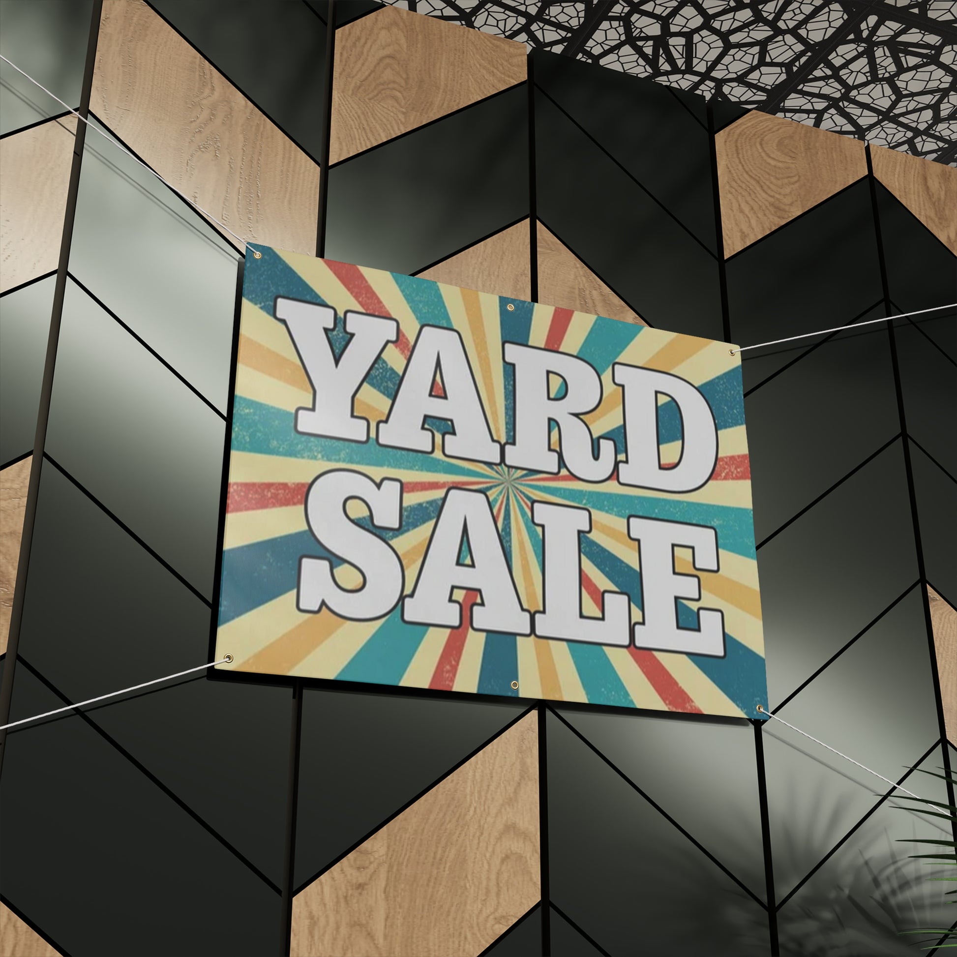 Retro Yard Sale Banner! Boho Yard Sale Banner! Garage Sale Signs! Yard Sale Signs! For adding a custom touch to any home, look no further than our personalized vinyl banner. Made with a 15oz block-out scrim vinyl material, these banners are gorgeous both for indoor and outdoor use. All banners come with a trimmed edge, including brass grommets every 2-3 feet for easy hanging. 4x white hanging ropes included.
