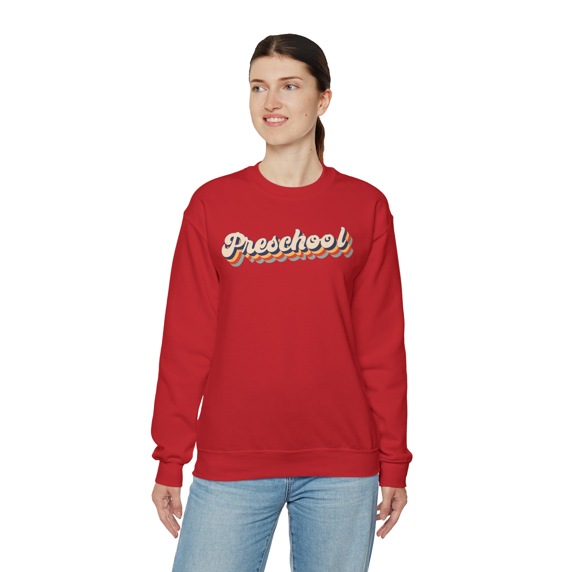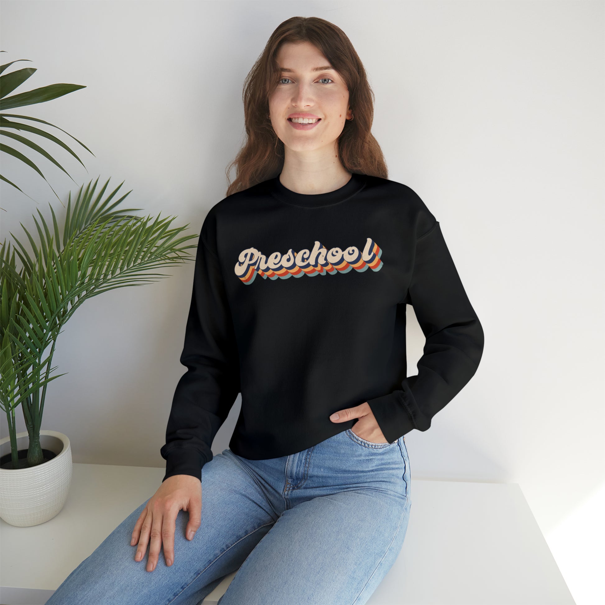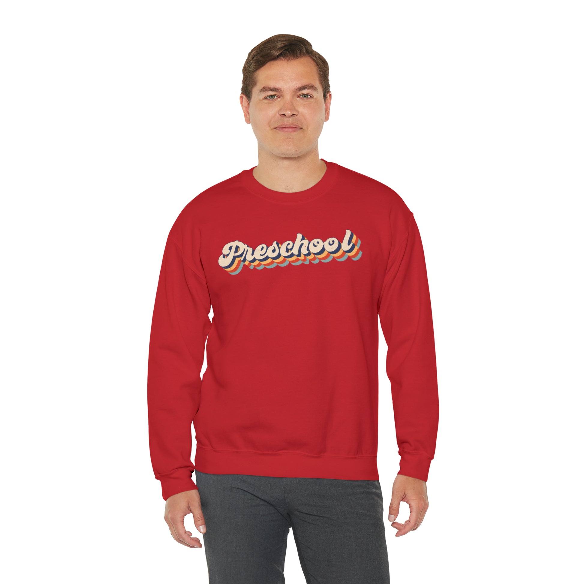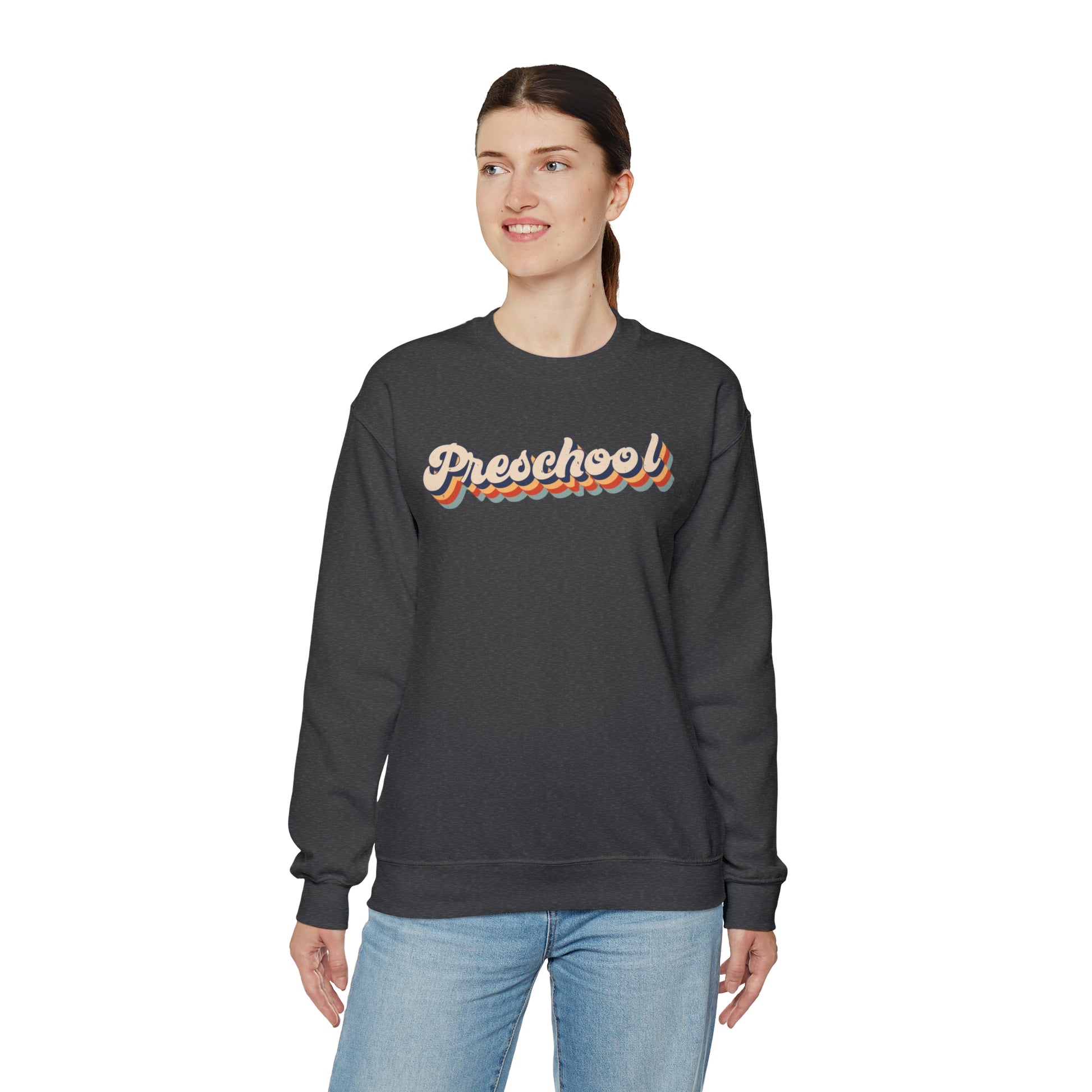 This is such a cute rainbow retro designed sweatshirt for Preschool teachers. Buy it as a gift for your favorite preschool teacher. Ideal for any situation, a unisex heavy blend crewneck sweatshirt is pure comfort. These garments are made from polyester and cotton. This combination helps designs come out looking fresh and beautiful. The collar is ribbed knit, so it retains its shape even after washing. There are no itchy side seams on these sweaters.
