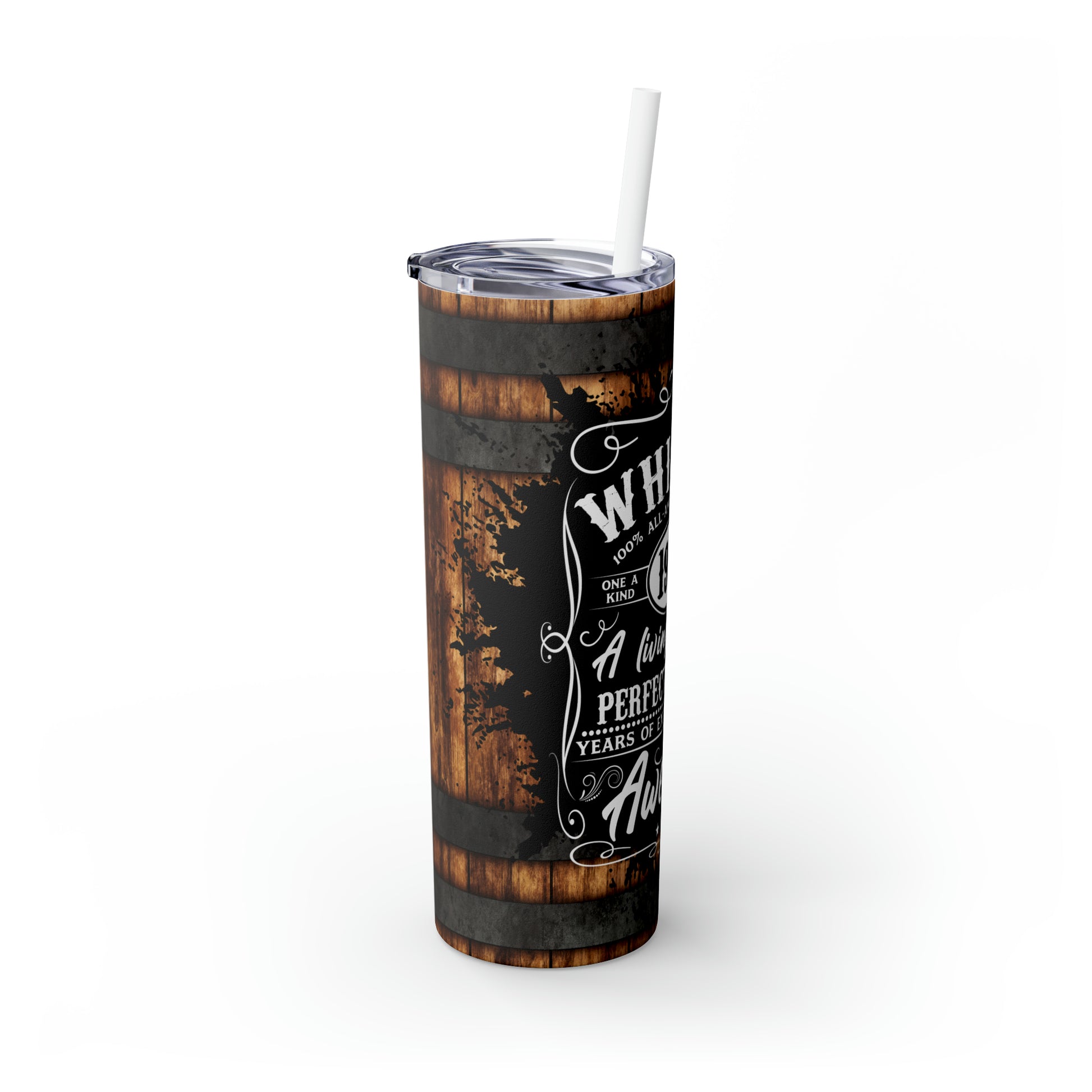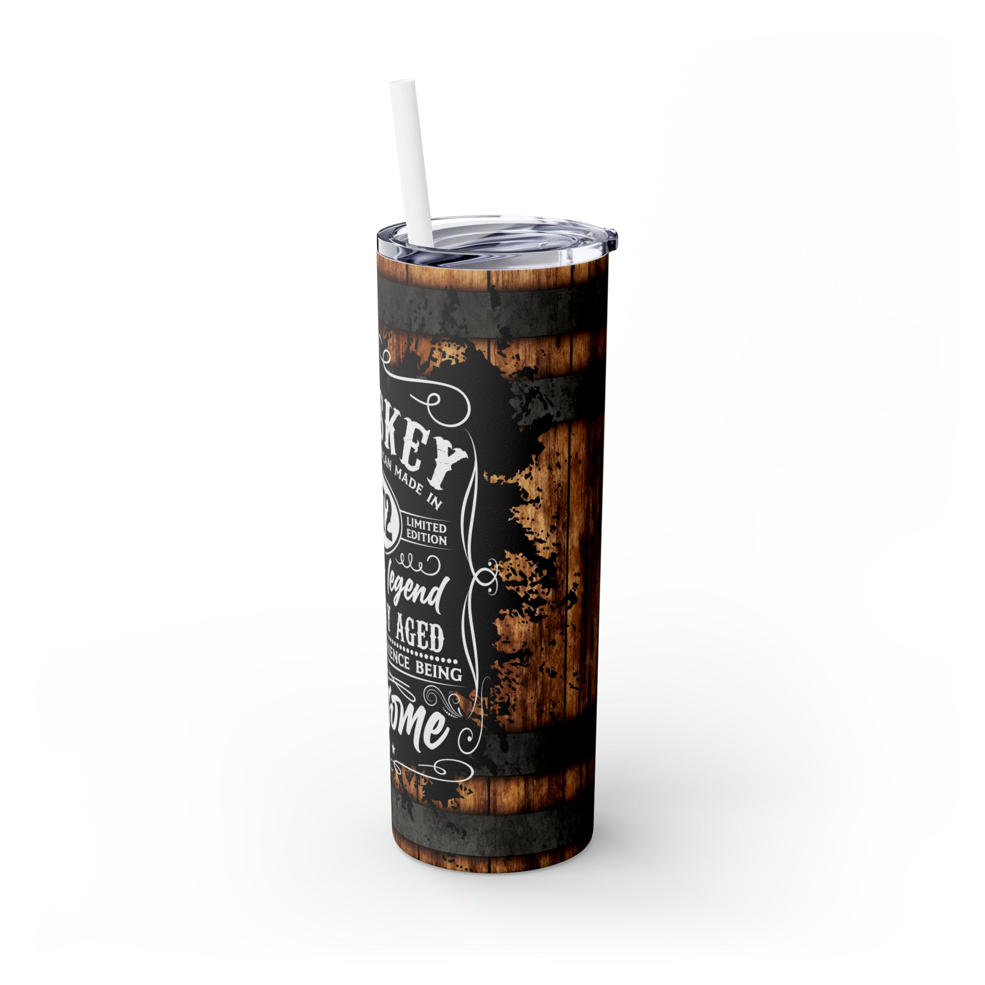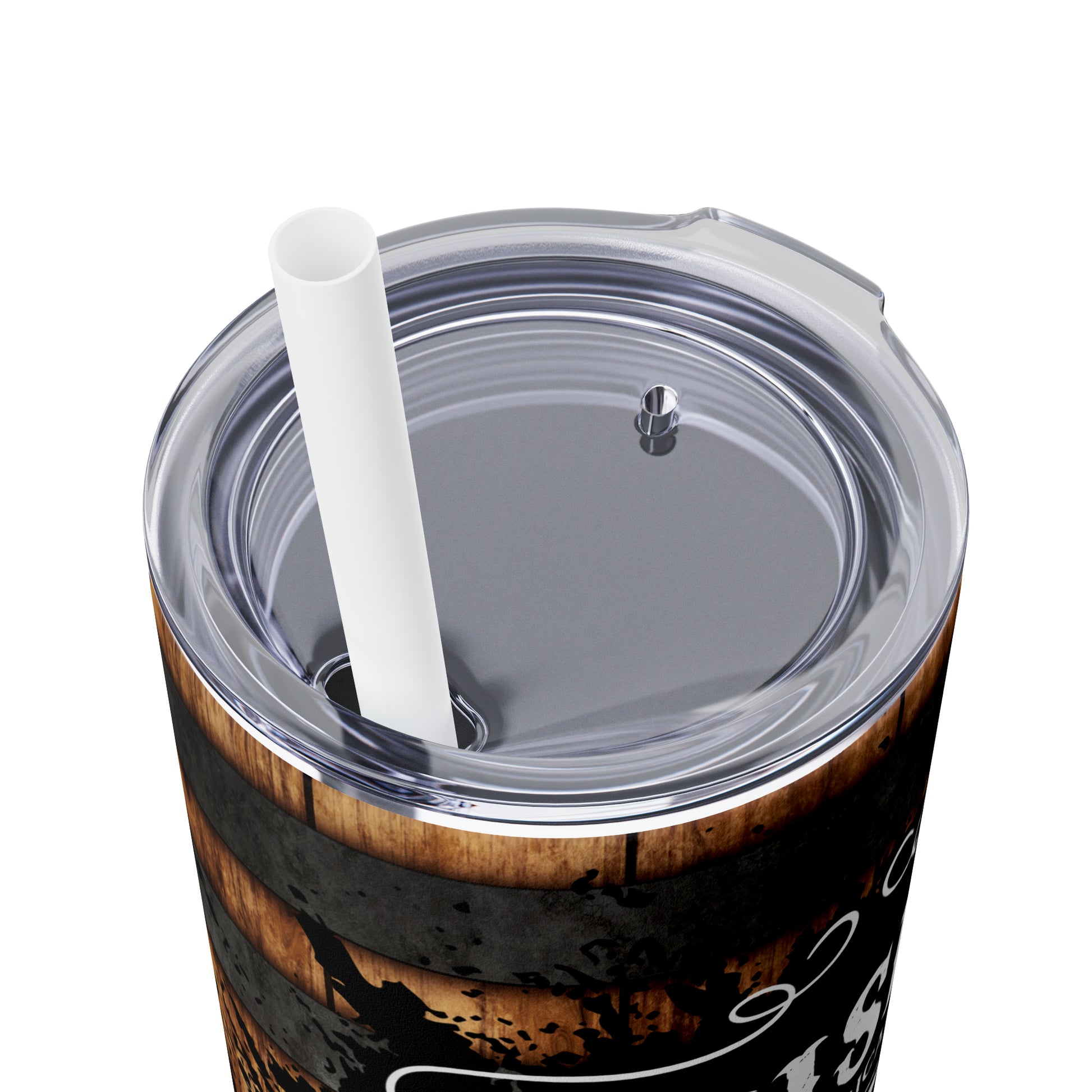 Rustic Barrel Whiskey Themed Skinny Tumbler with Straw, 20oz