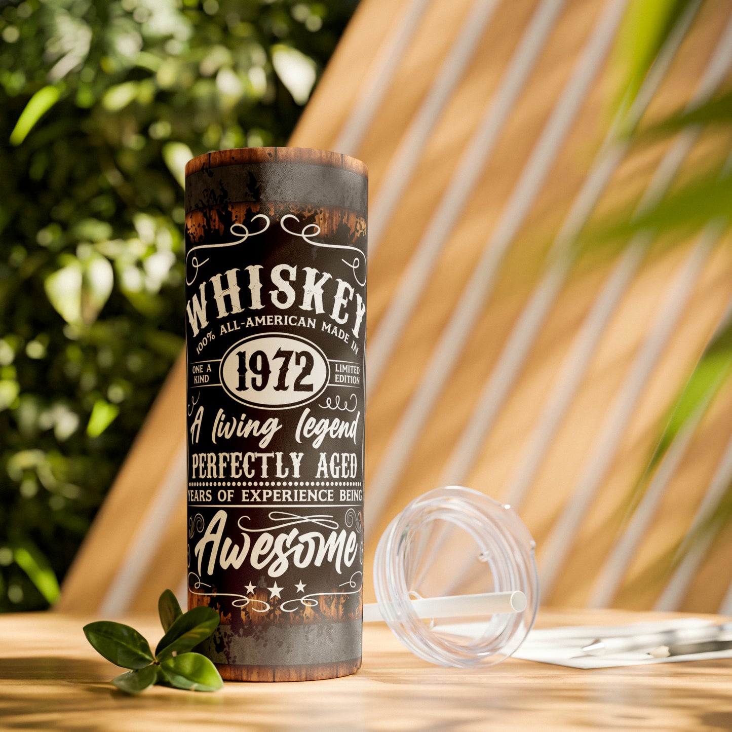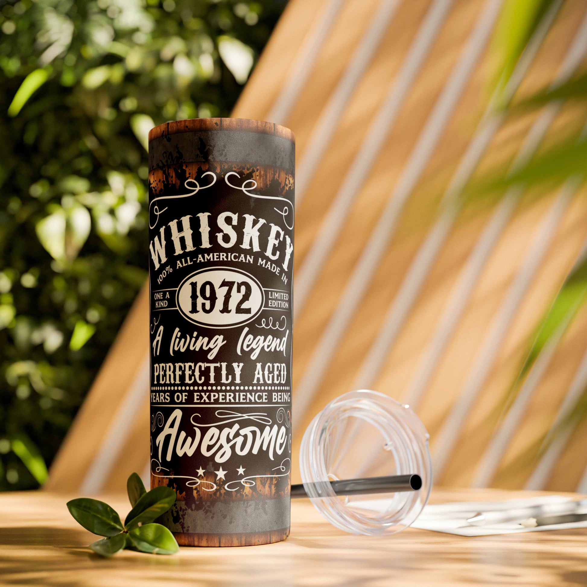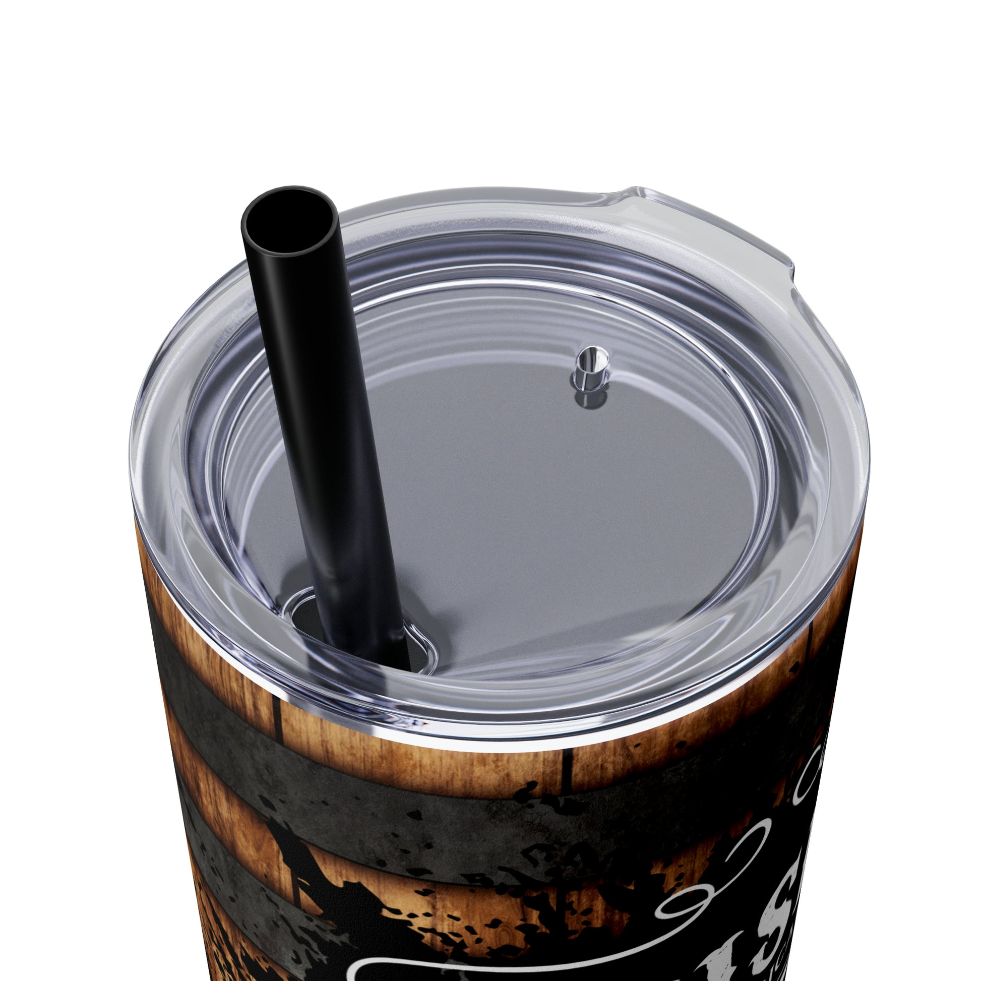 Rustic Barrel Whiskey Themed Skinny Tumbler with Straw, 20oz