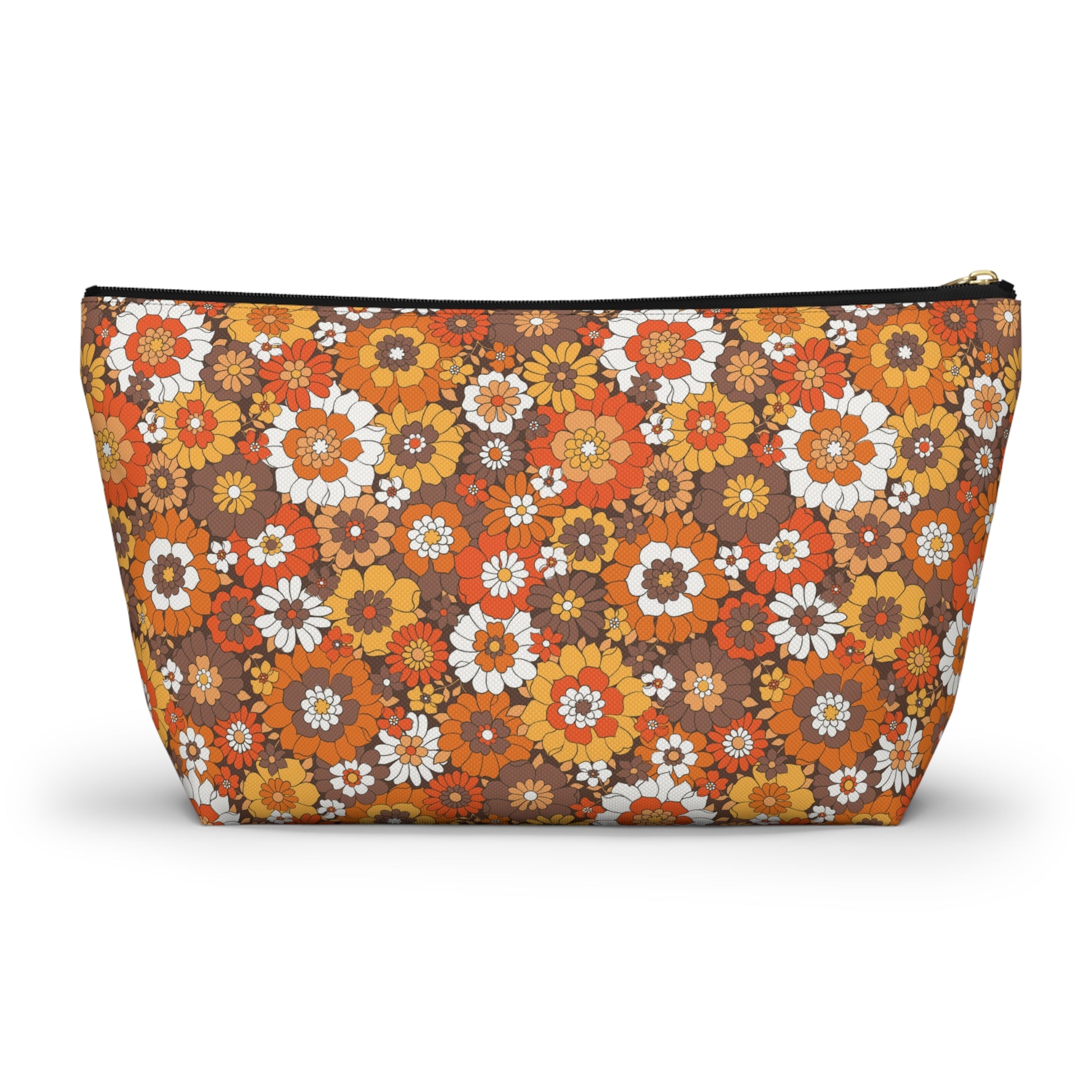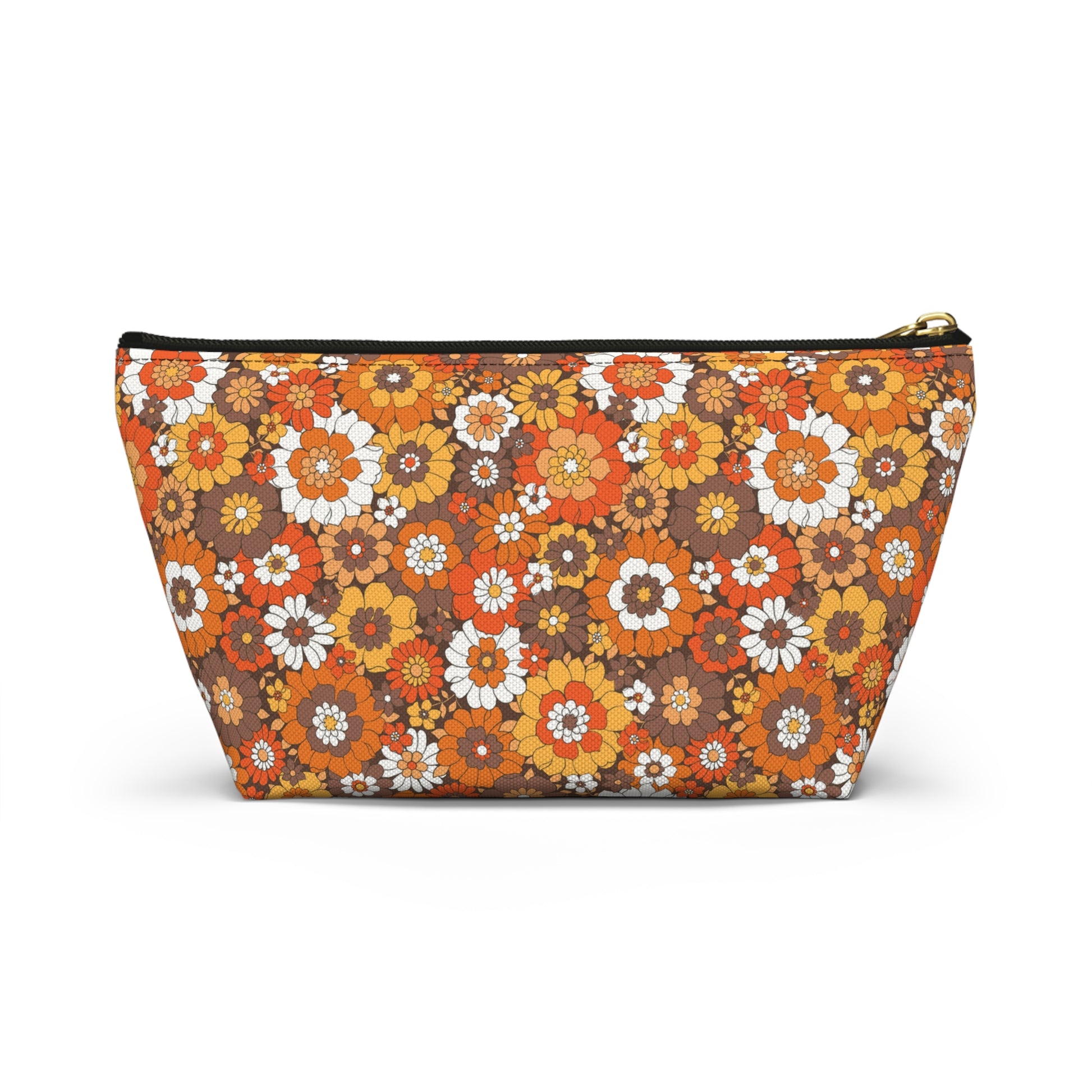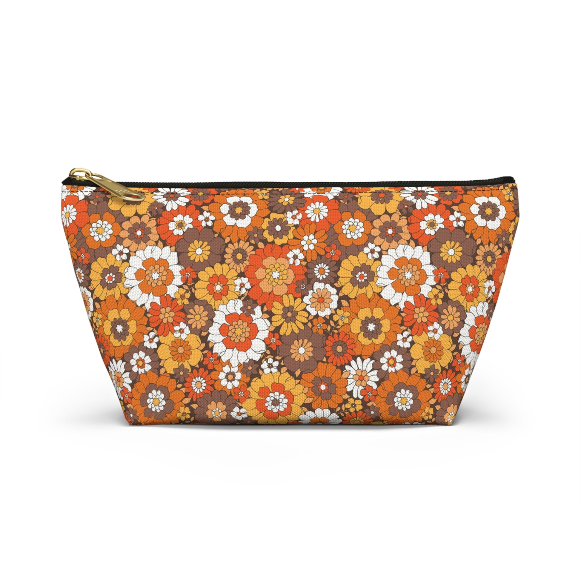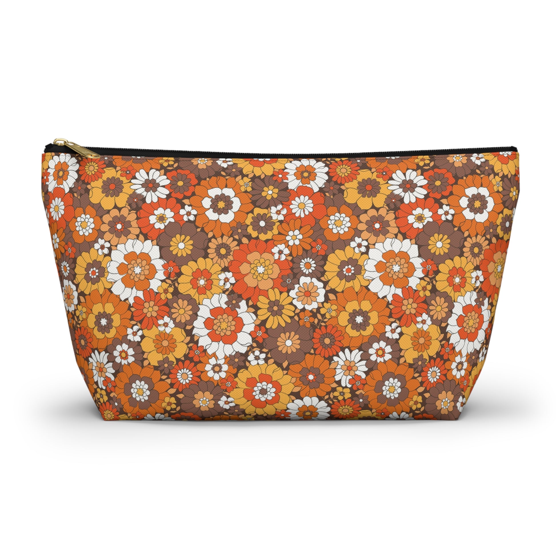 This Retro brown floral print pouch is great for to carry around or use for a first aid kit, make-up, medicine bag, pencil pouch, etc.... Our t-bottom pouches vary from small to large and can be used for pretty much anything. Fall Print bags They make excellent pencil cases and cosmetic travel bags. They are constructed from a durable material with a zipper closure.