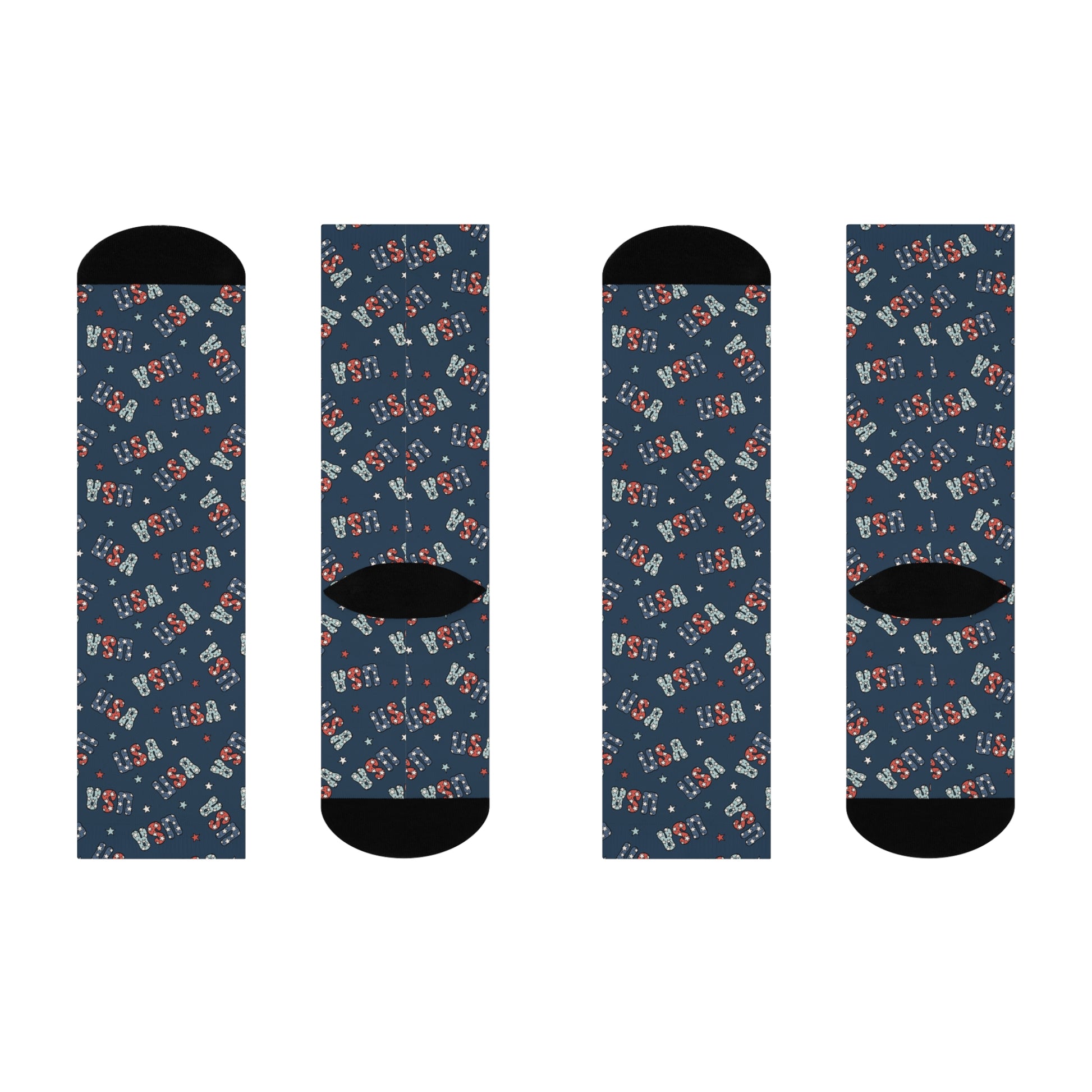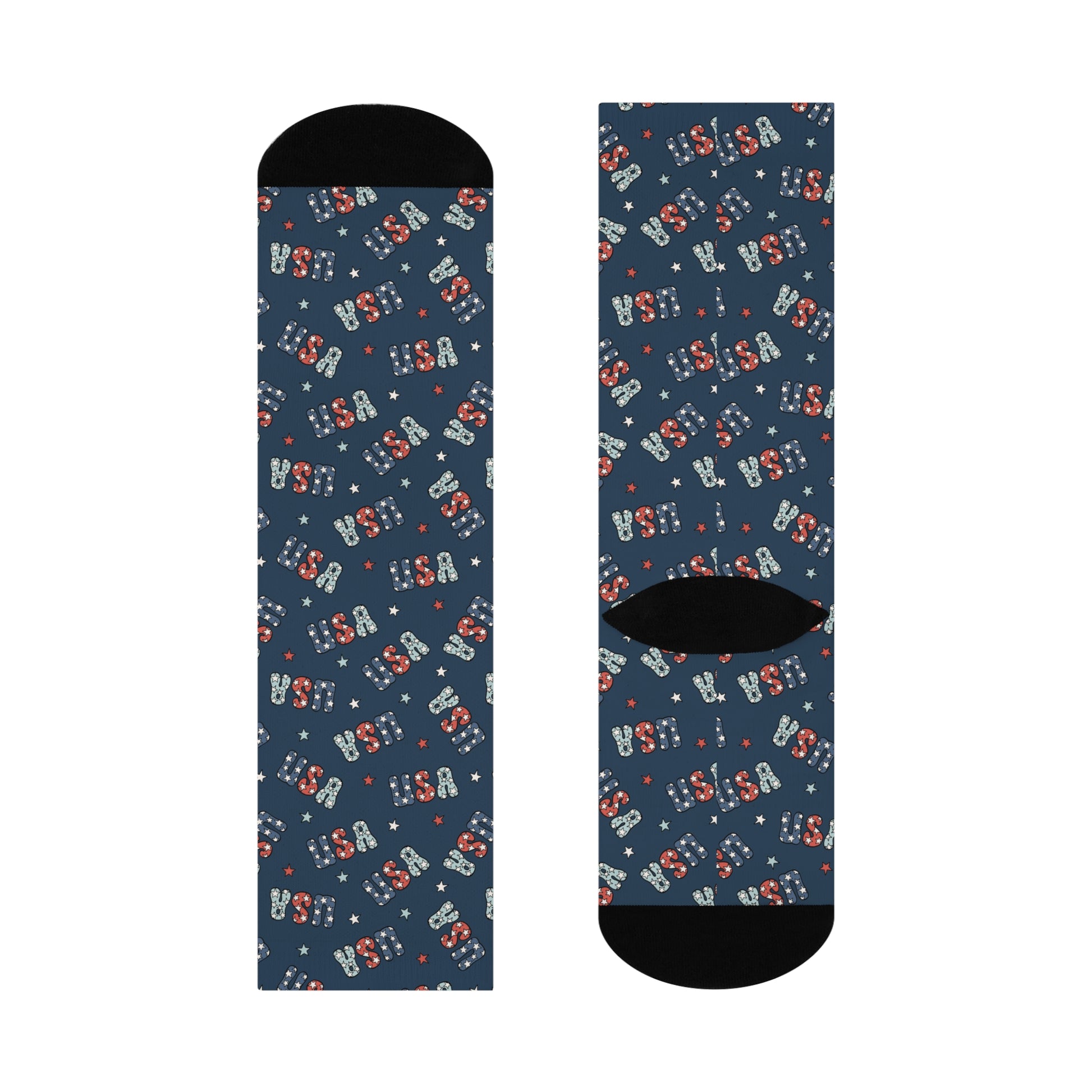 USA! America Socks! Creative Socks! Fun Socks! Red, White and Blue Socks! Cushioned crew socks are a one-sizstyle upll solution up to a men’s size 12. The base color is white with black on the toes and heel. The construction is 73% polyester, 18% nylon, 6% spandex, and 3% cotton. Add some foundational character with an all-over-print design; giving your customers a chance to style-up their footwear.