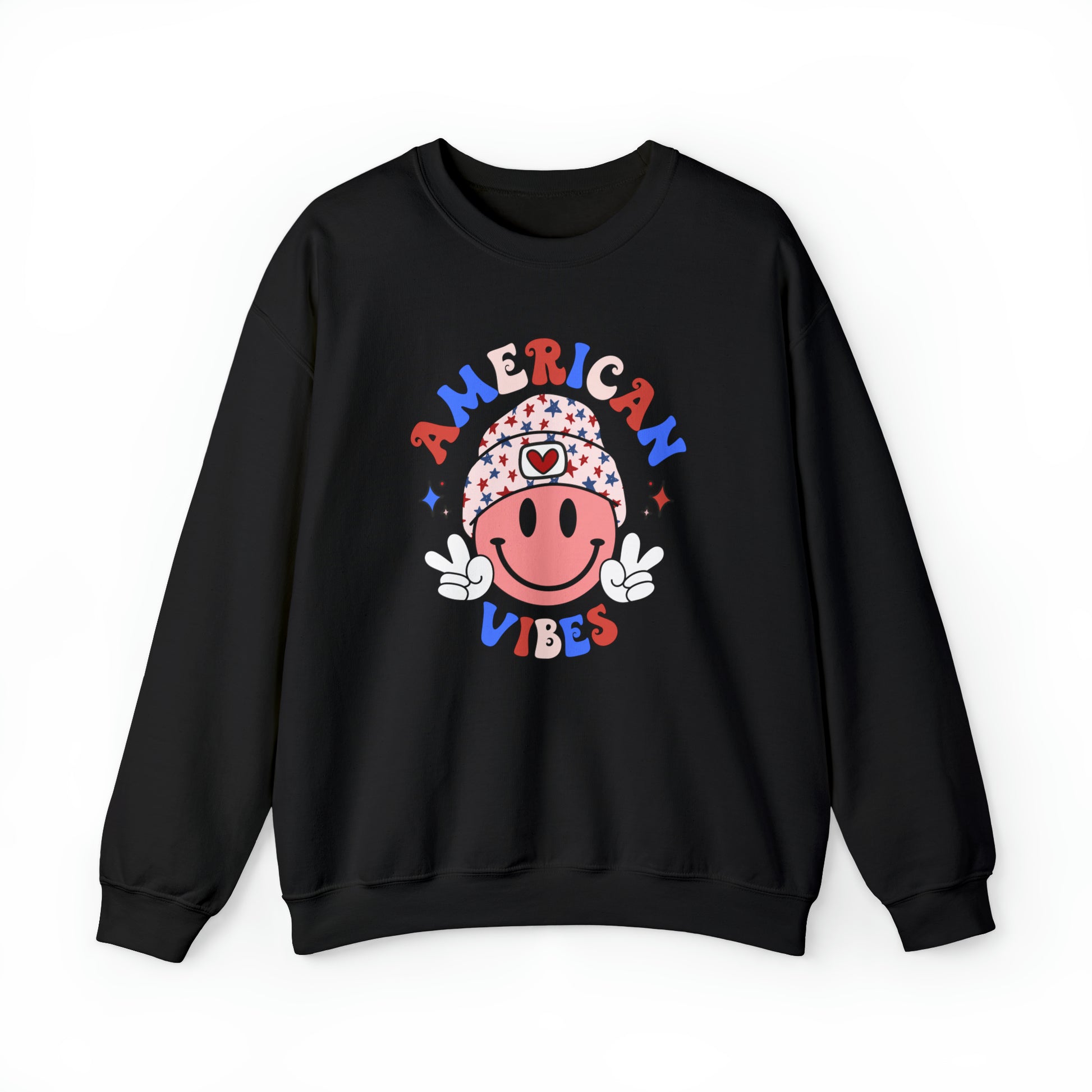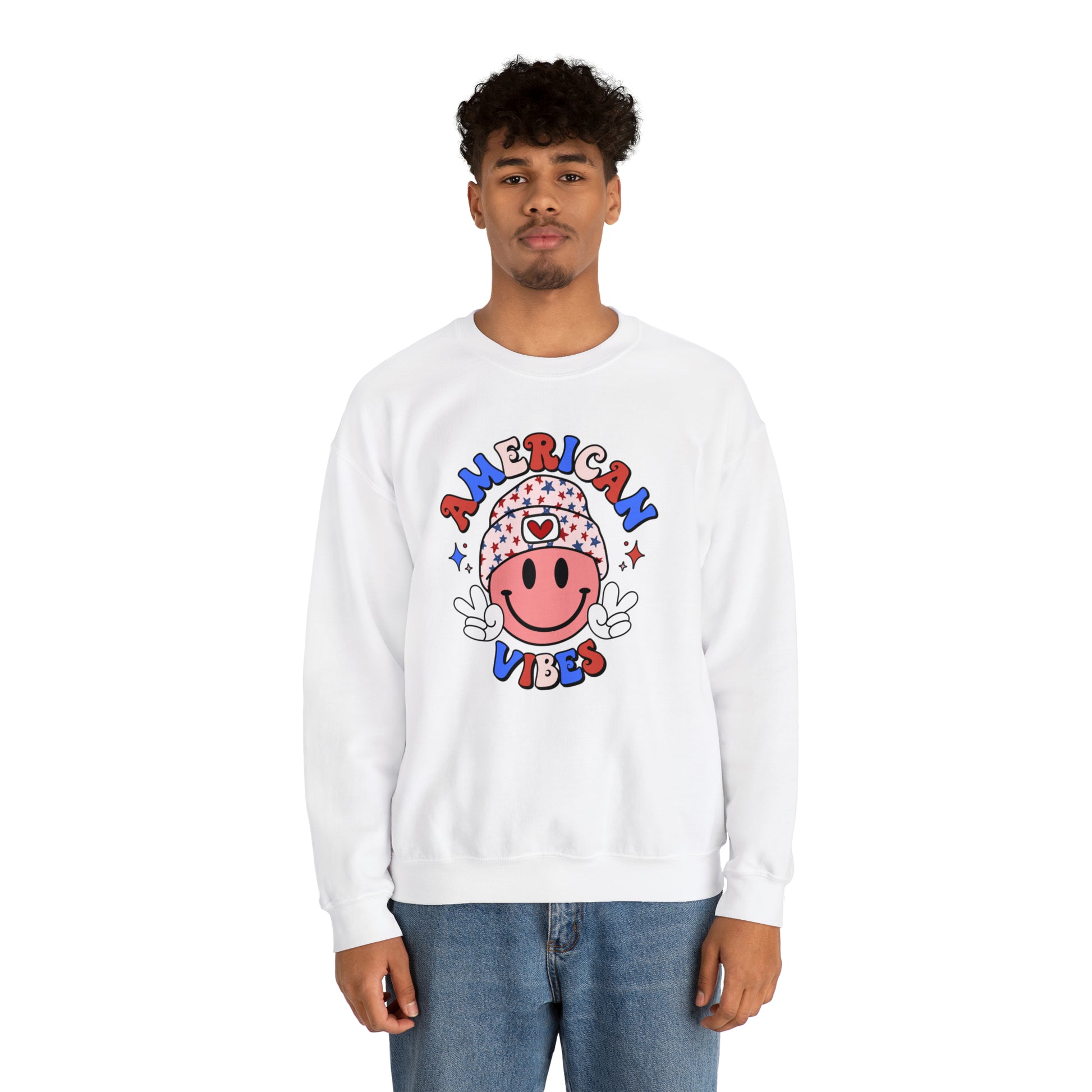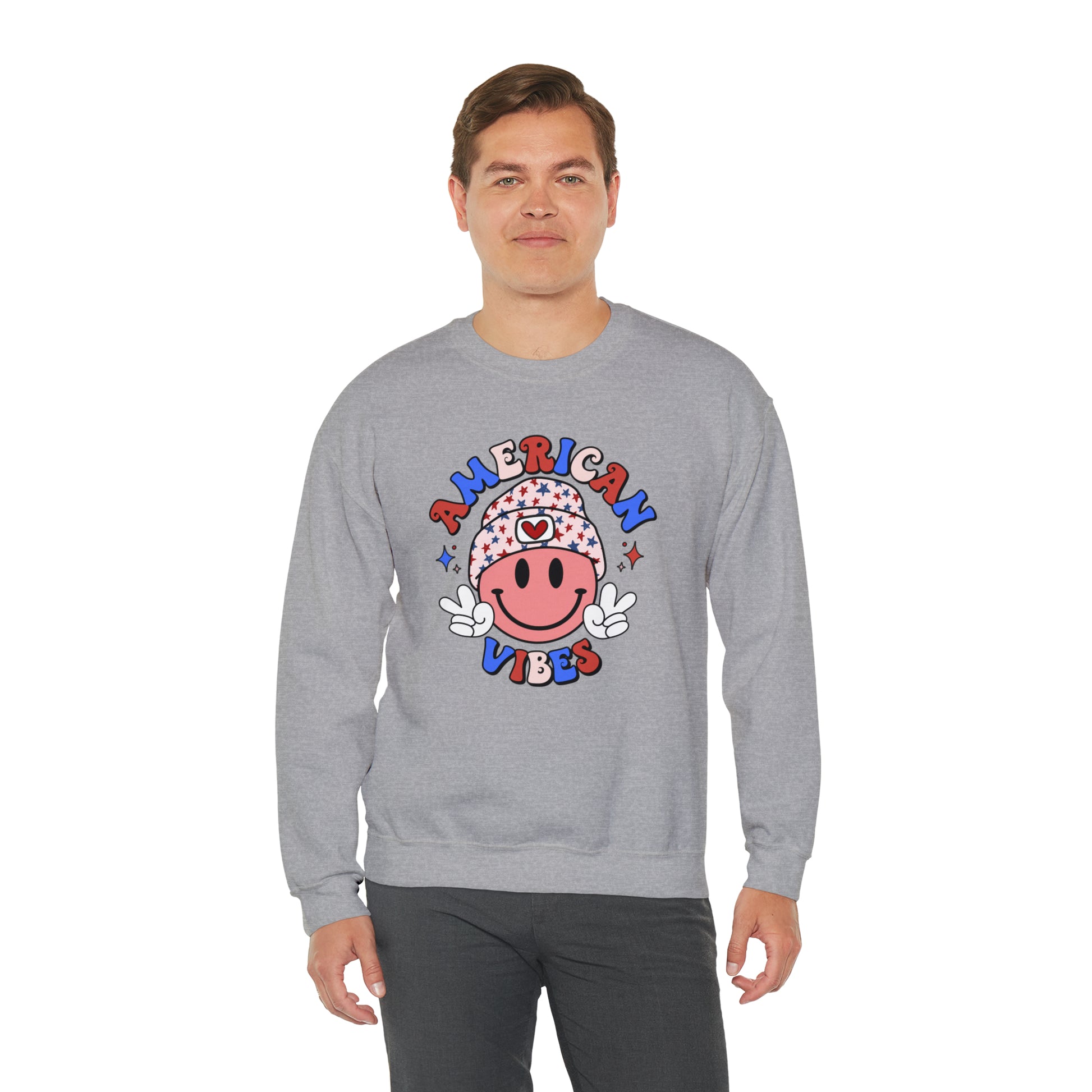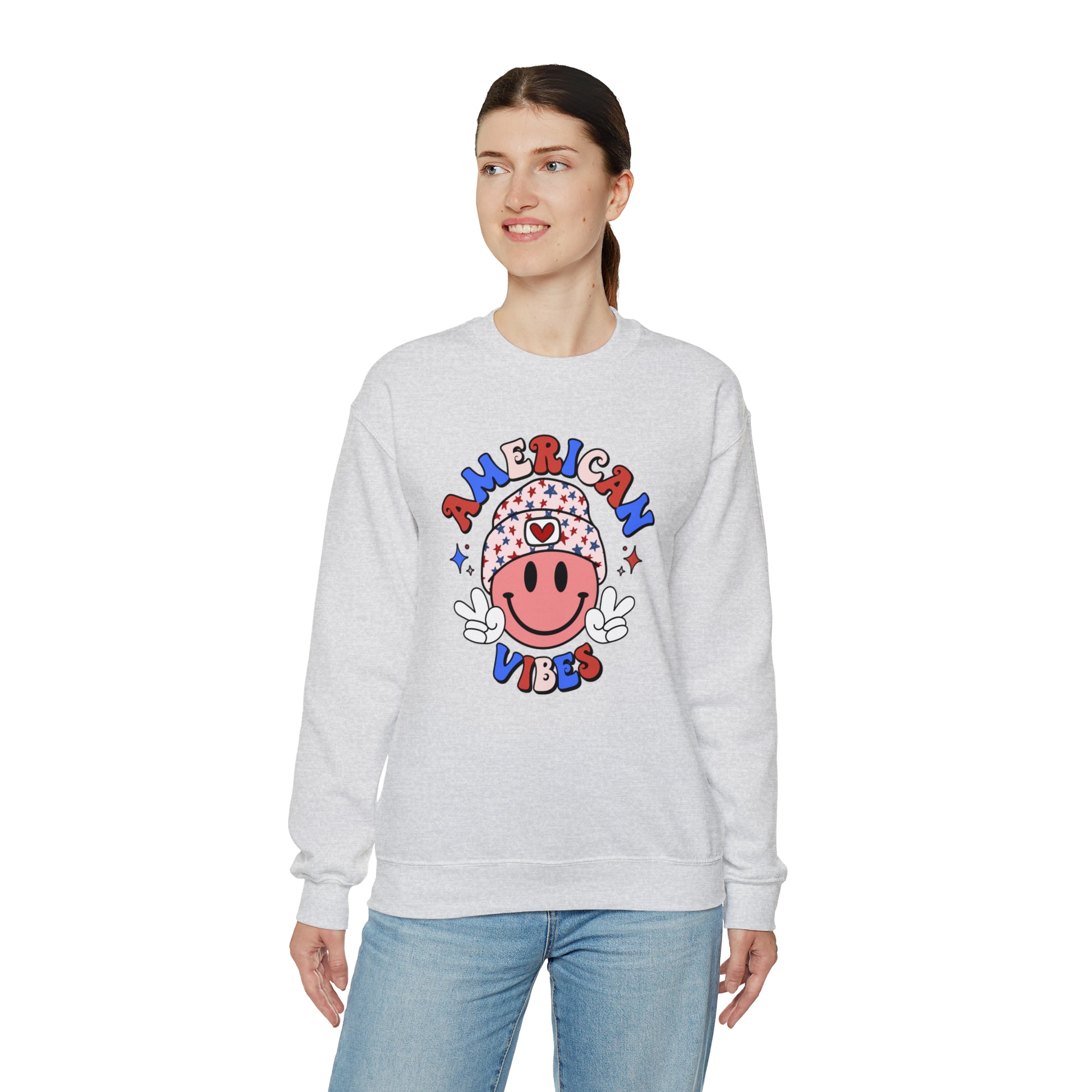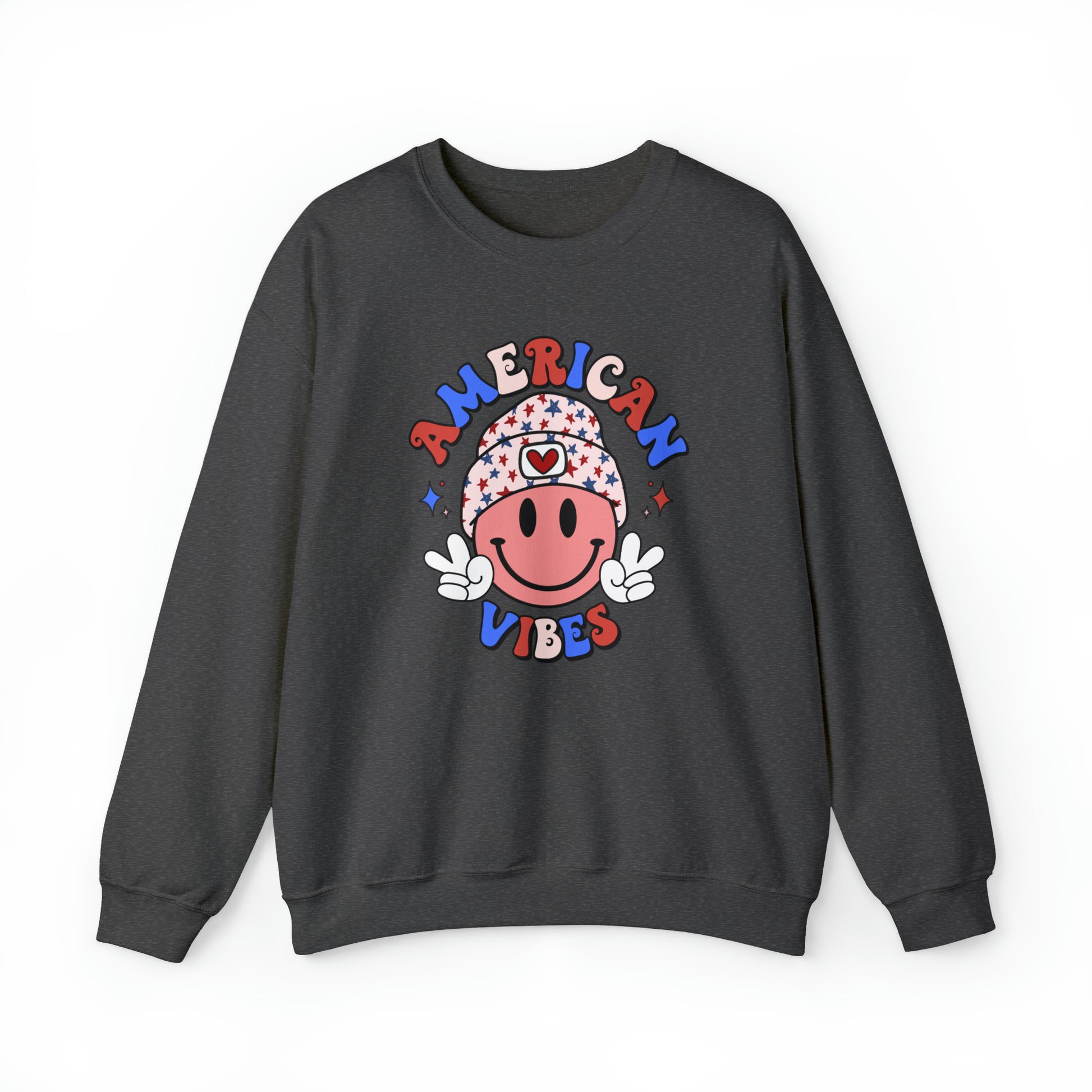 USA American Vibes Smiley Face with Heart Beanie and Peace Signs Heavy Blend™ Crewneck Sweatshirt
