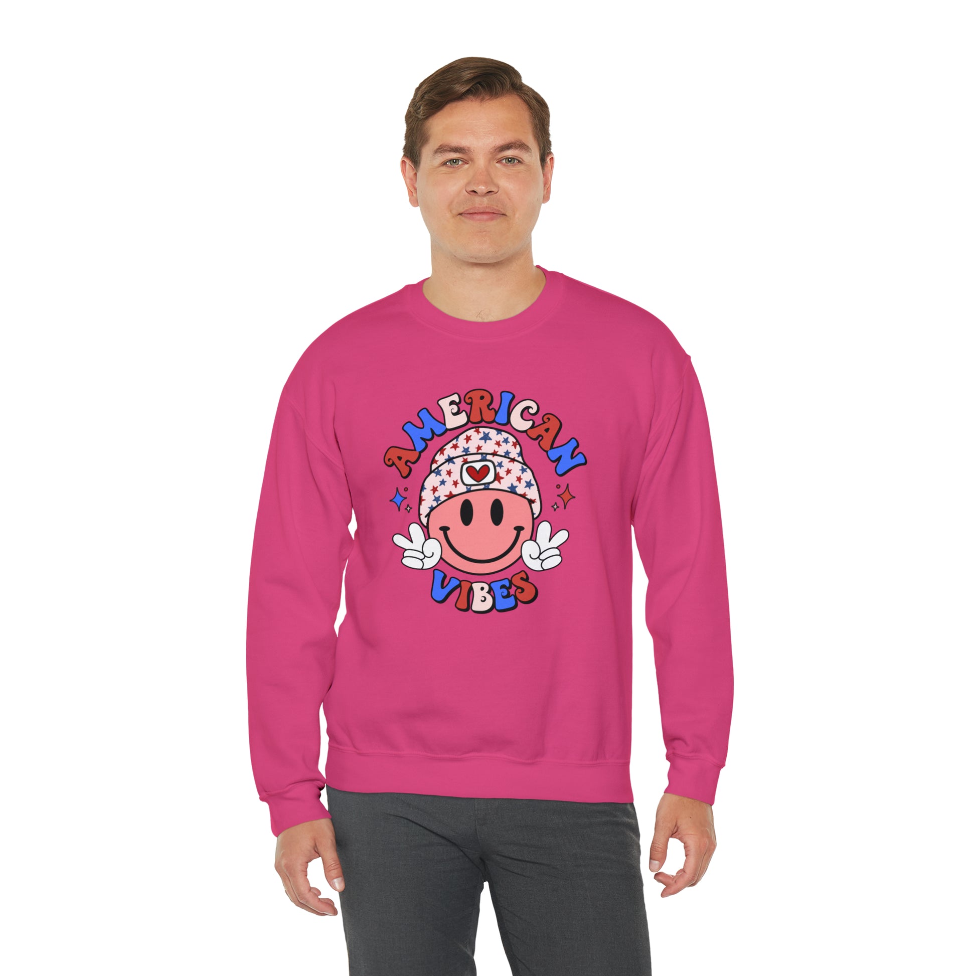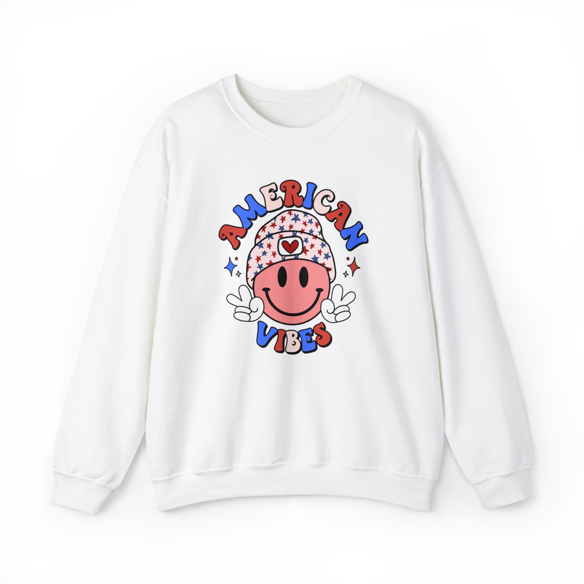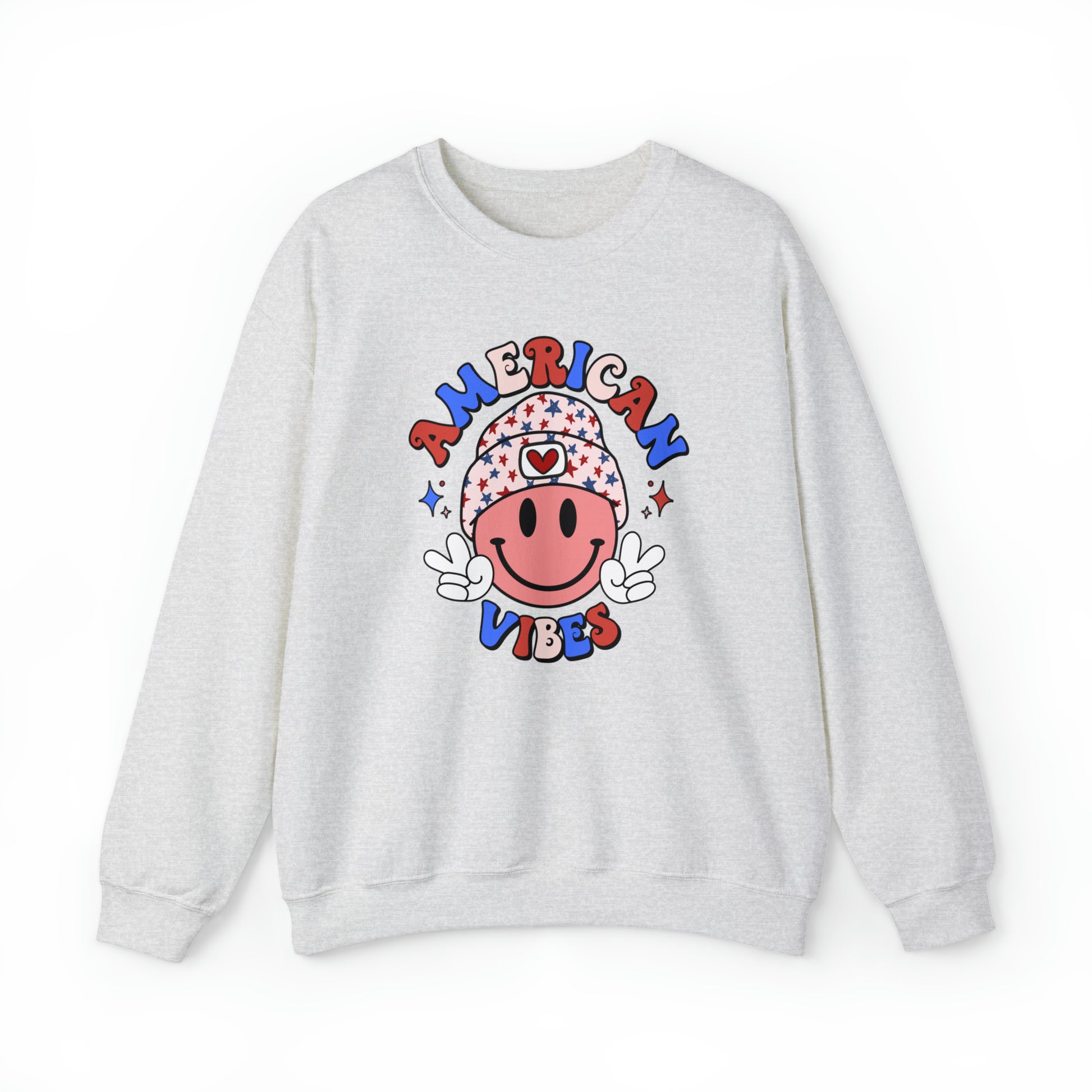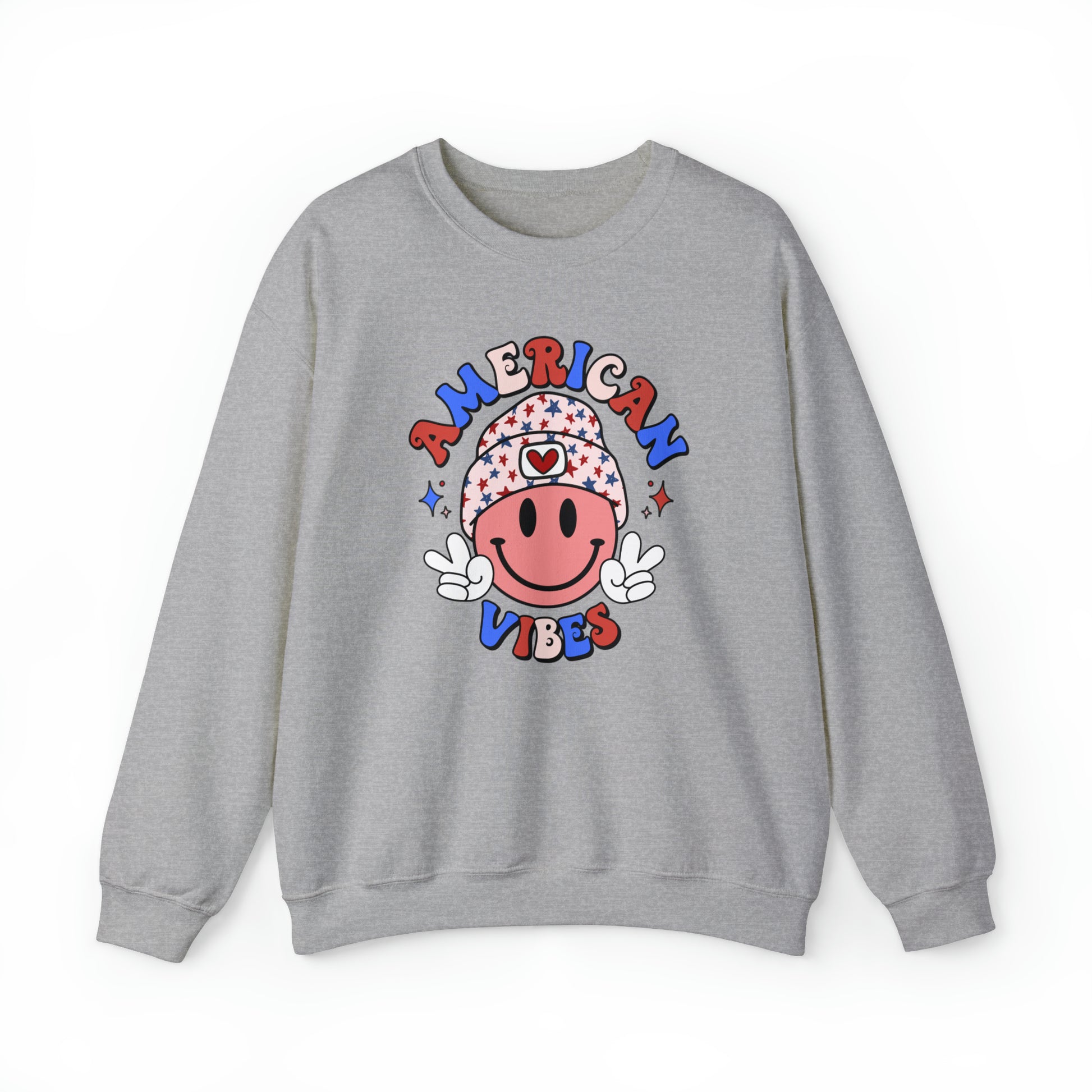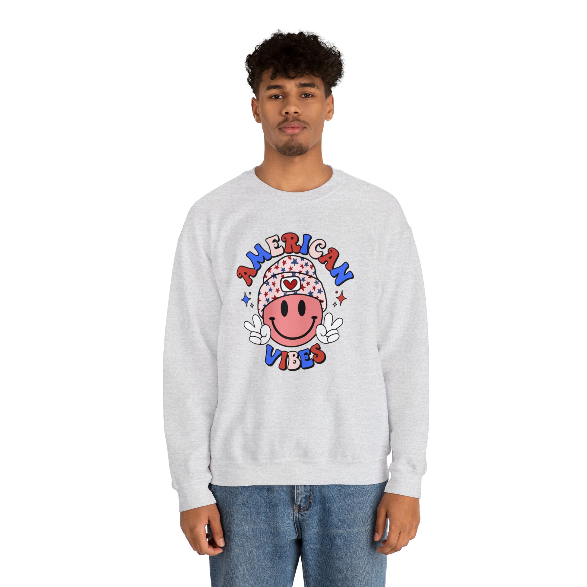 USA American Vibes Smiley Face with Heart Beanie and Peace Signs Heavy Blend™ Crewneck Sweatshirt
