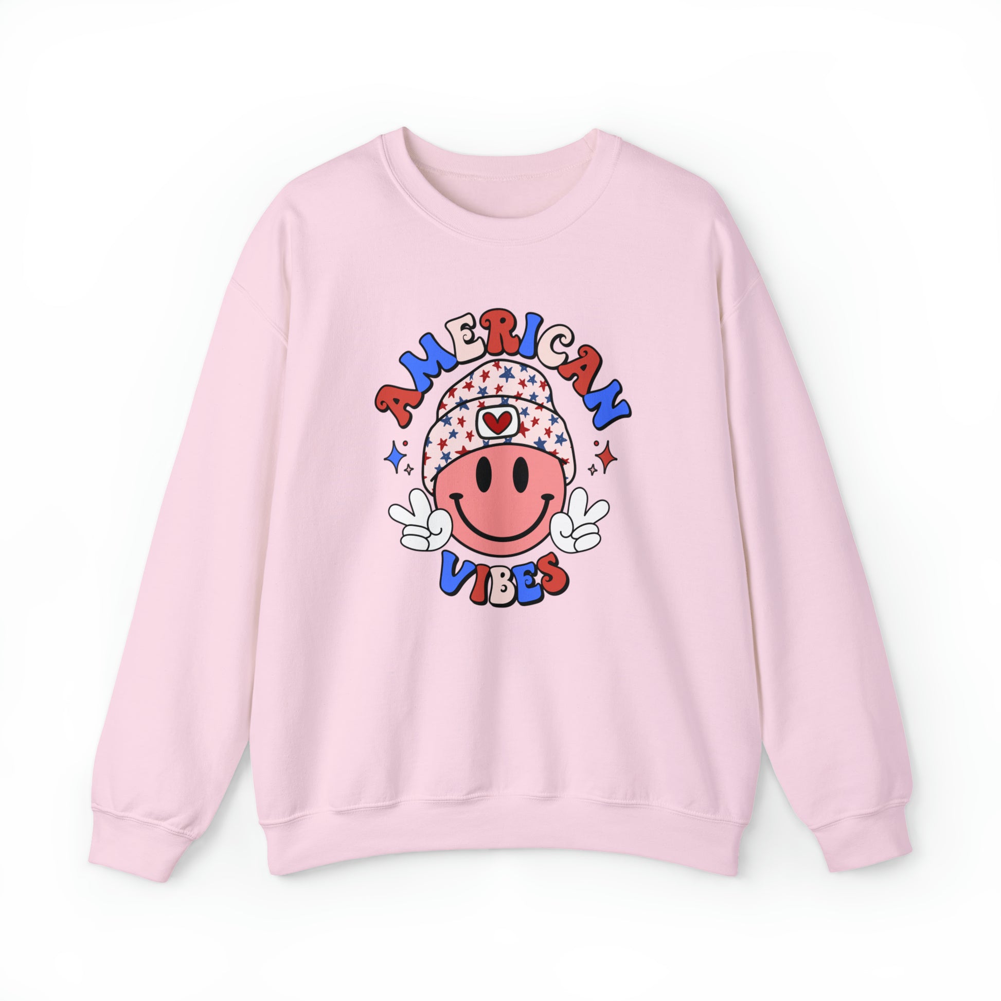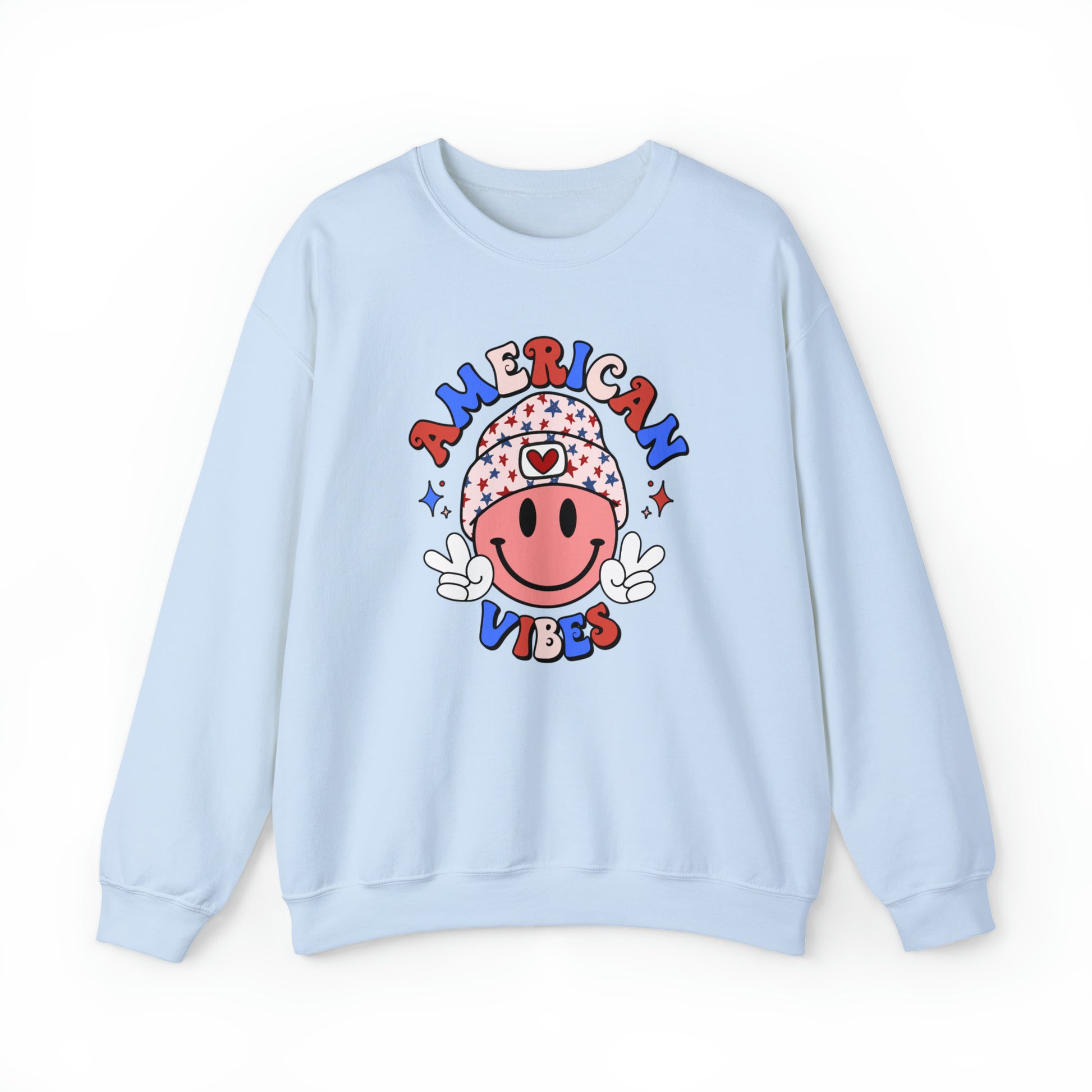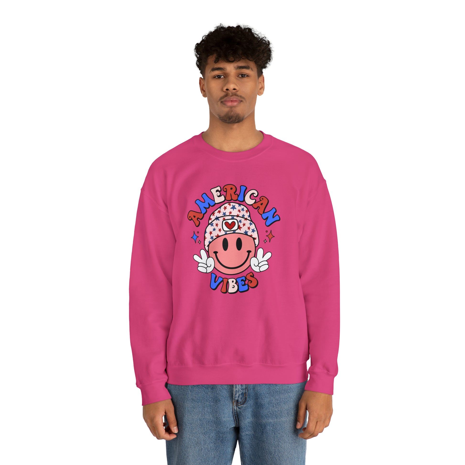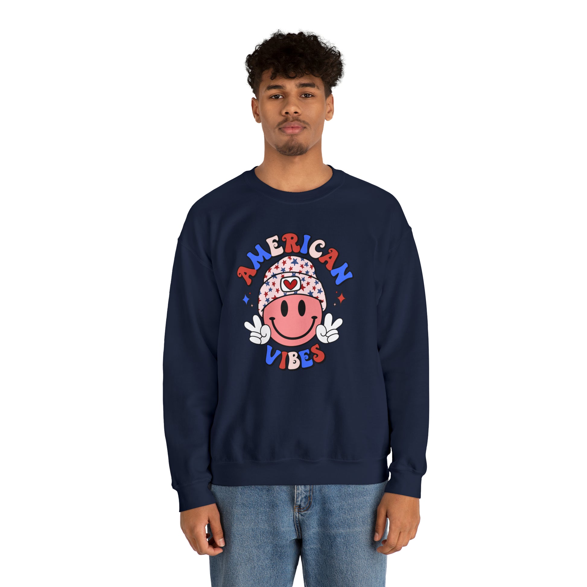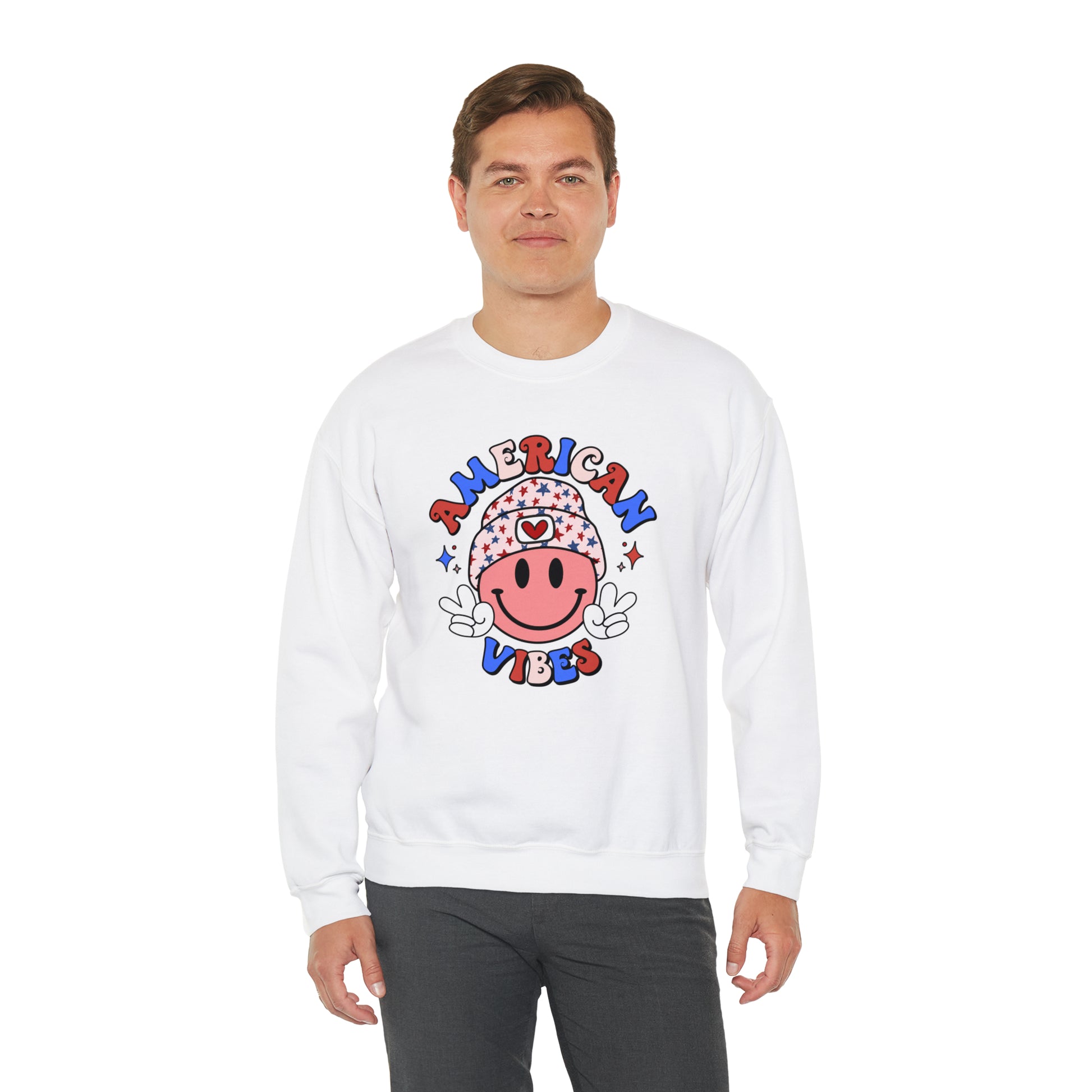 USA American Vibes Smiley Face with Heart Beanie and Peace Signs Heavy Blend™ Crewneck Sweatshirt