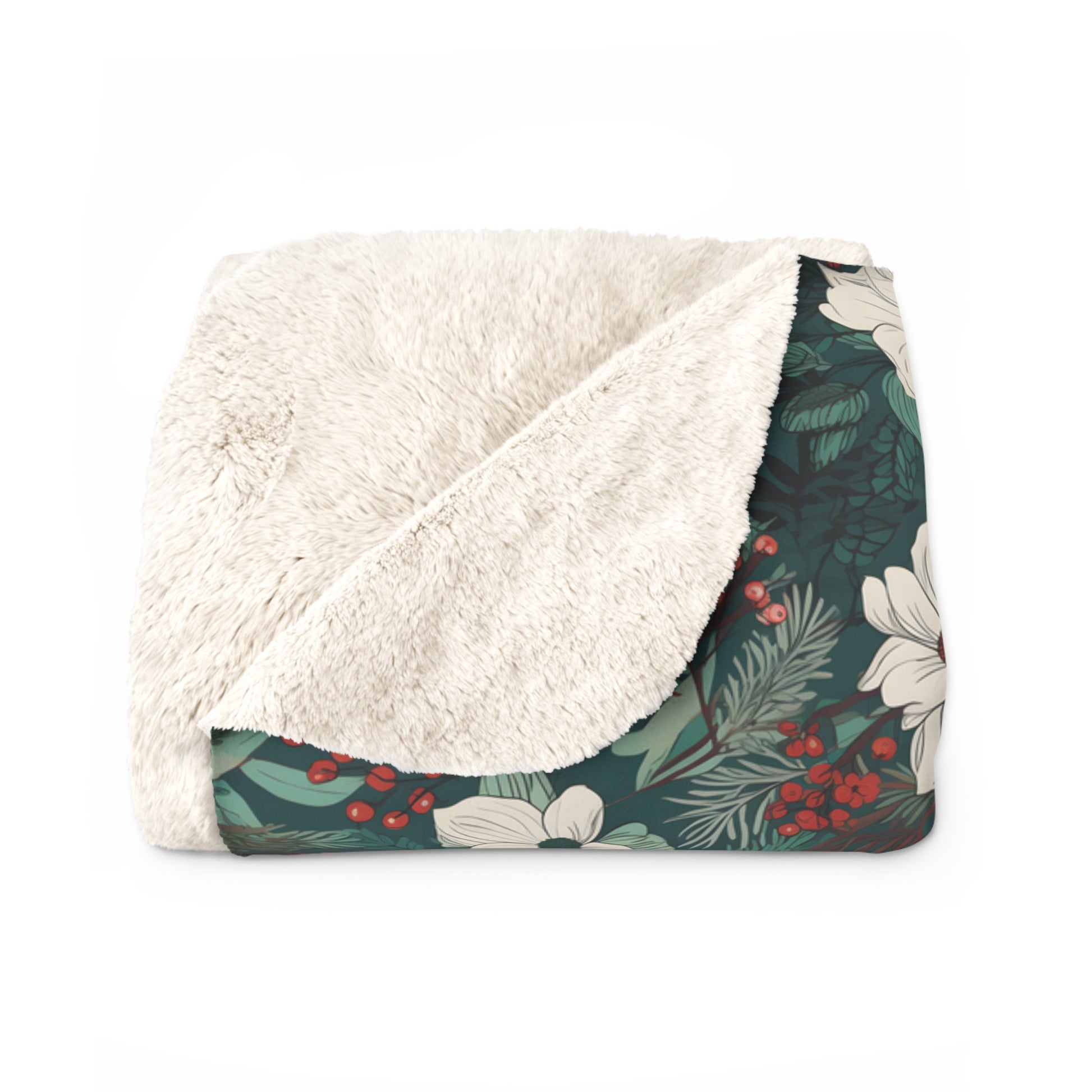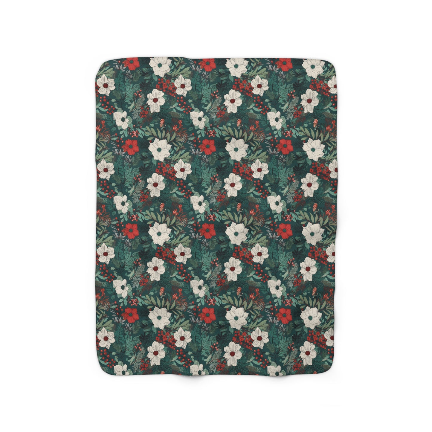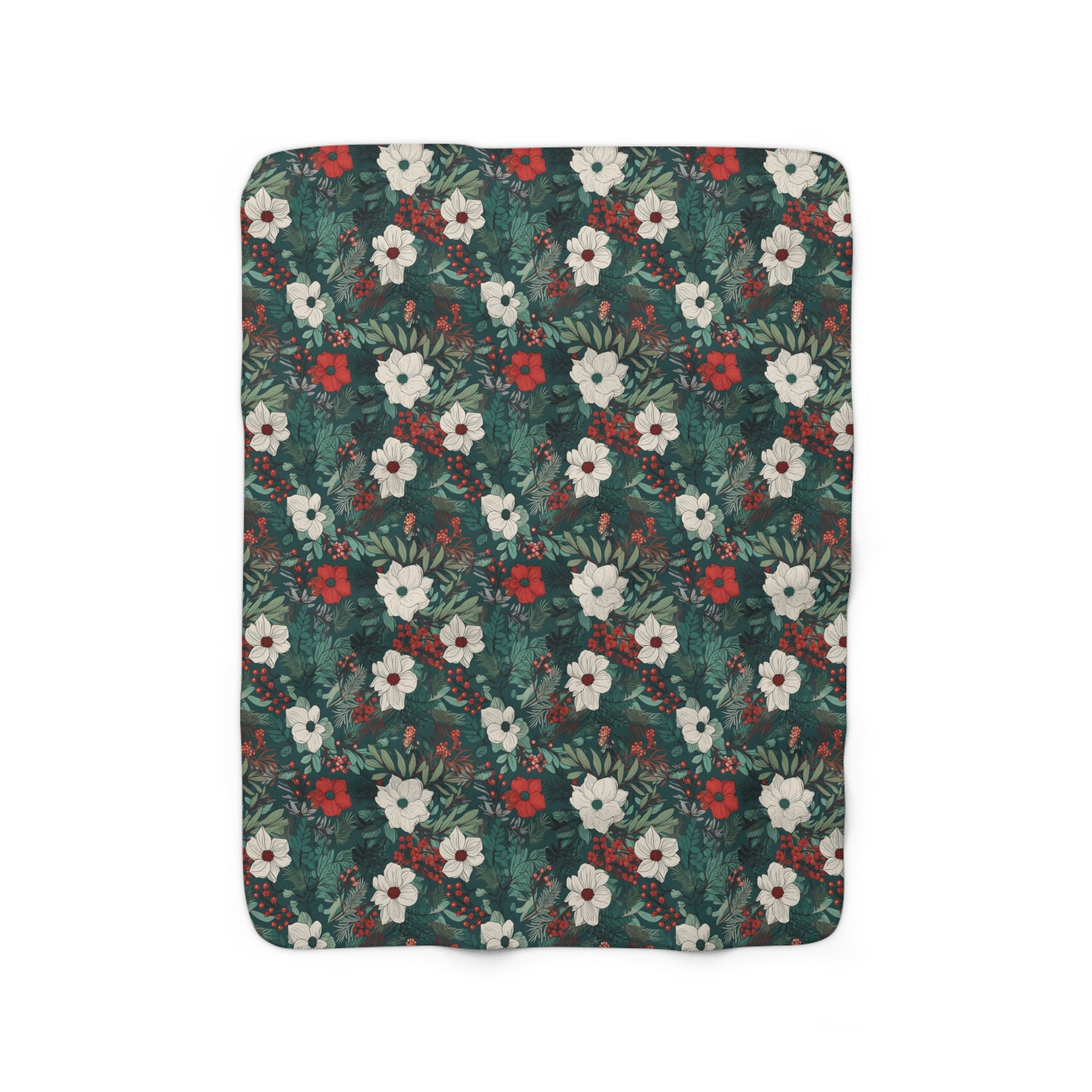White and Red Floral Christmas Botanical Sherpa Fleece Blanket
