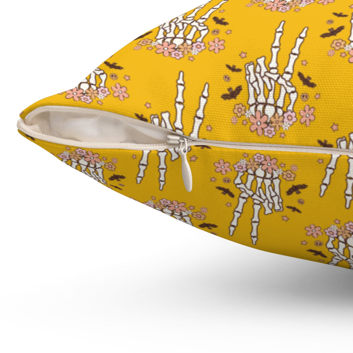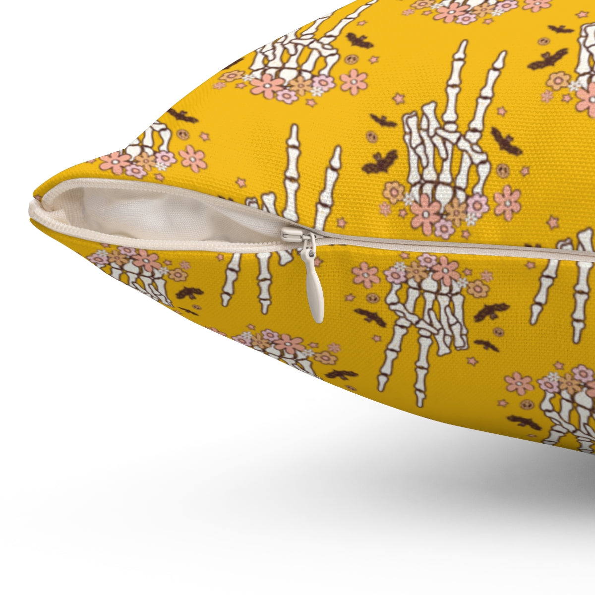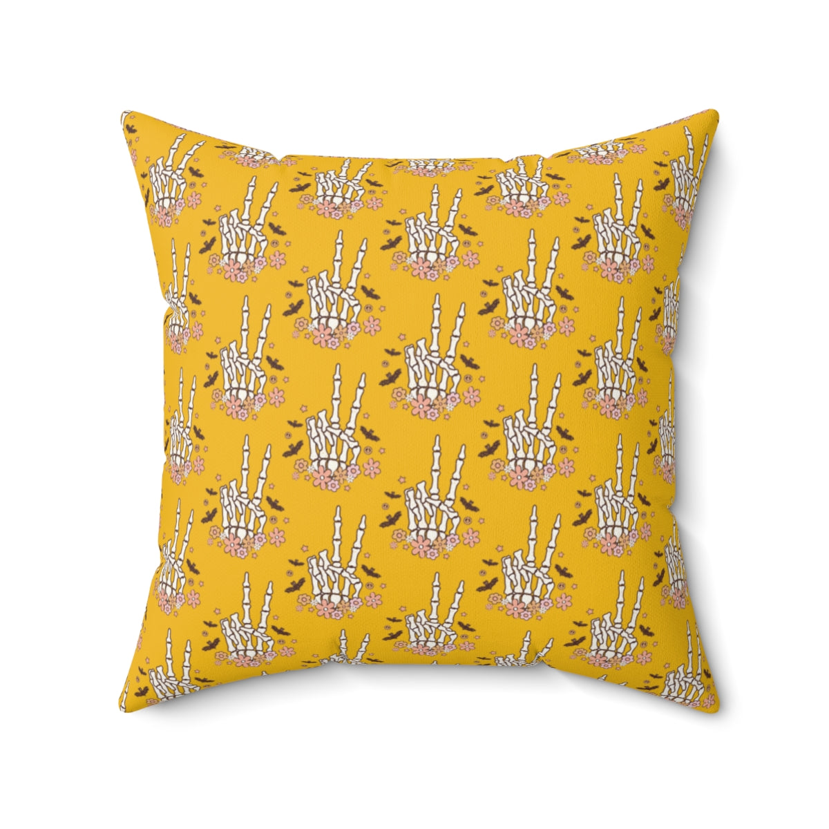 Yellow Boho Skeleton Hand Peace Sign Pattern Fall Halloween Spun Polyester Square Pillow